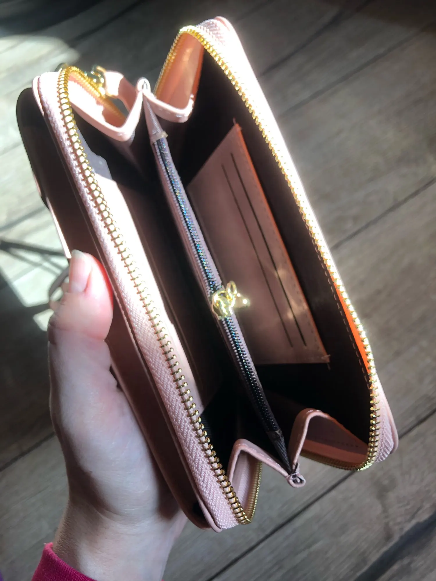 me ha encantado... la parte de guardar el móvil es exacto, mi móvil es grande y queda perfectamente, la otra parte de cremallera trae para monedero, tus tarjetas y un poco más, es muy completo, tienes todo en un bolso pequeño que no te va a pesar en nada, ha superado mis expectativas