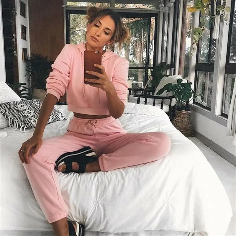Женская модная спортивная одежда из 2 предметов, укороченный топ с капюшоном + длинные тренировочные штаны