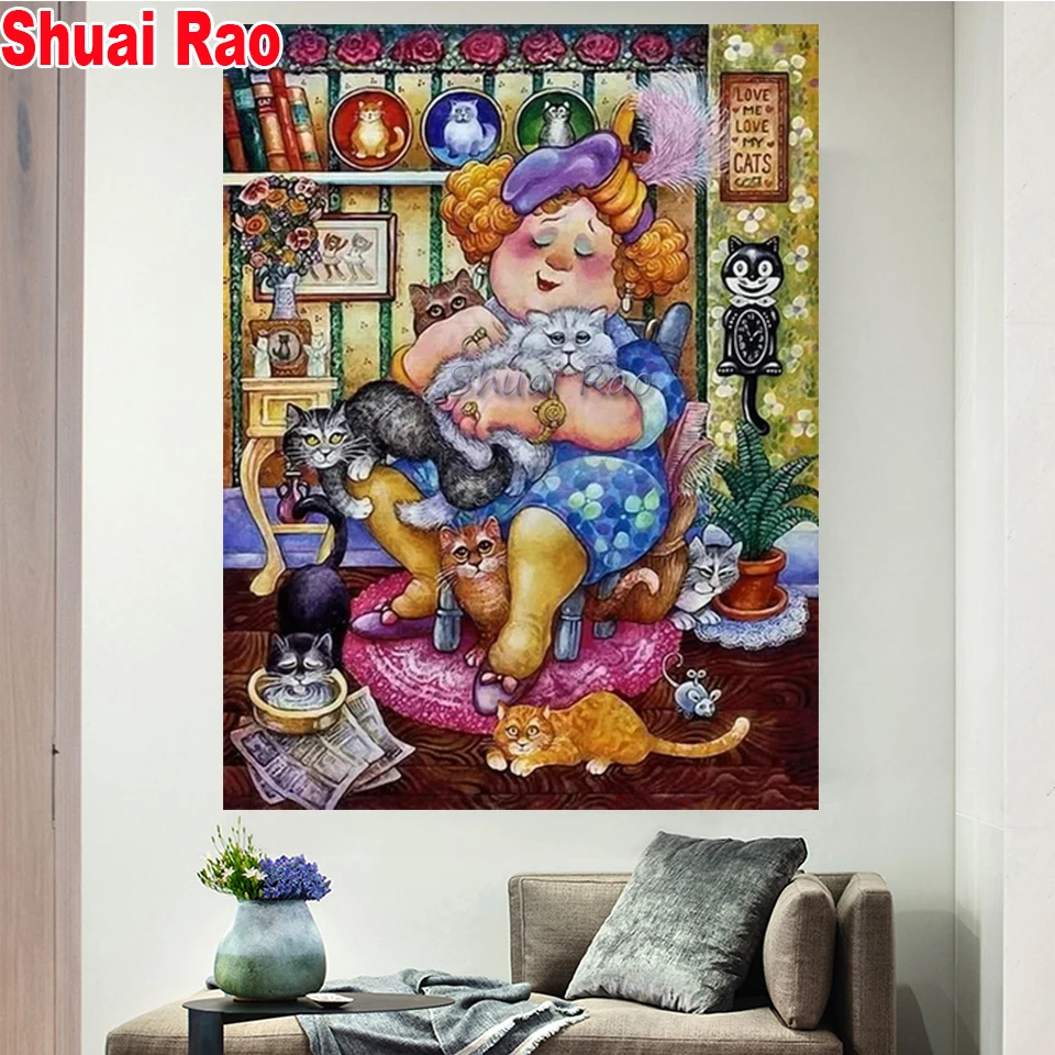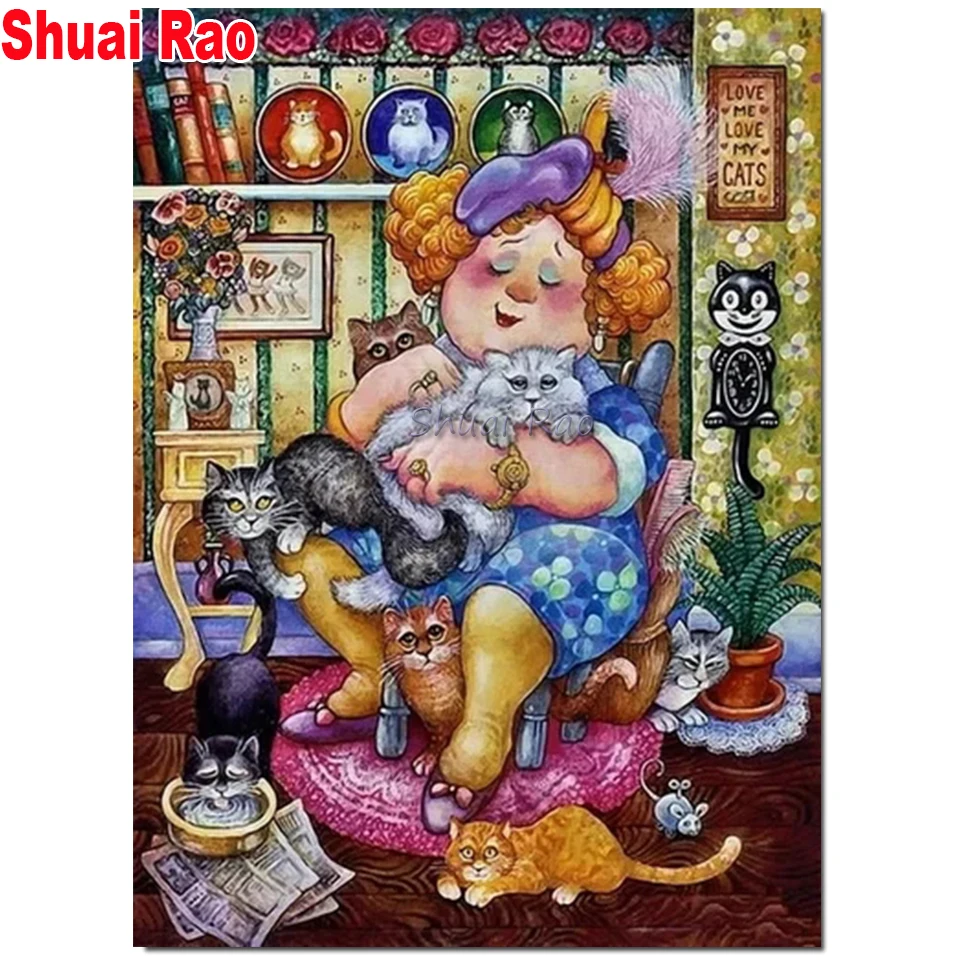 Полноразмернаякруглая Алмазная мозаика, мультяшная Толстая Леди и кошки, 5 d Алмазная вышивка сделай сам, для женщин и животных, алмазная краска