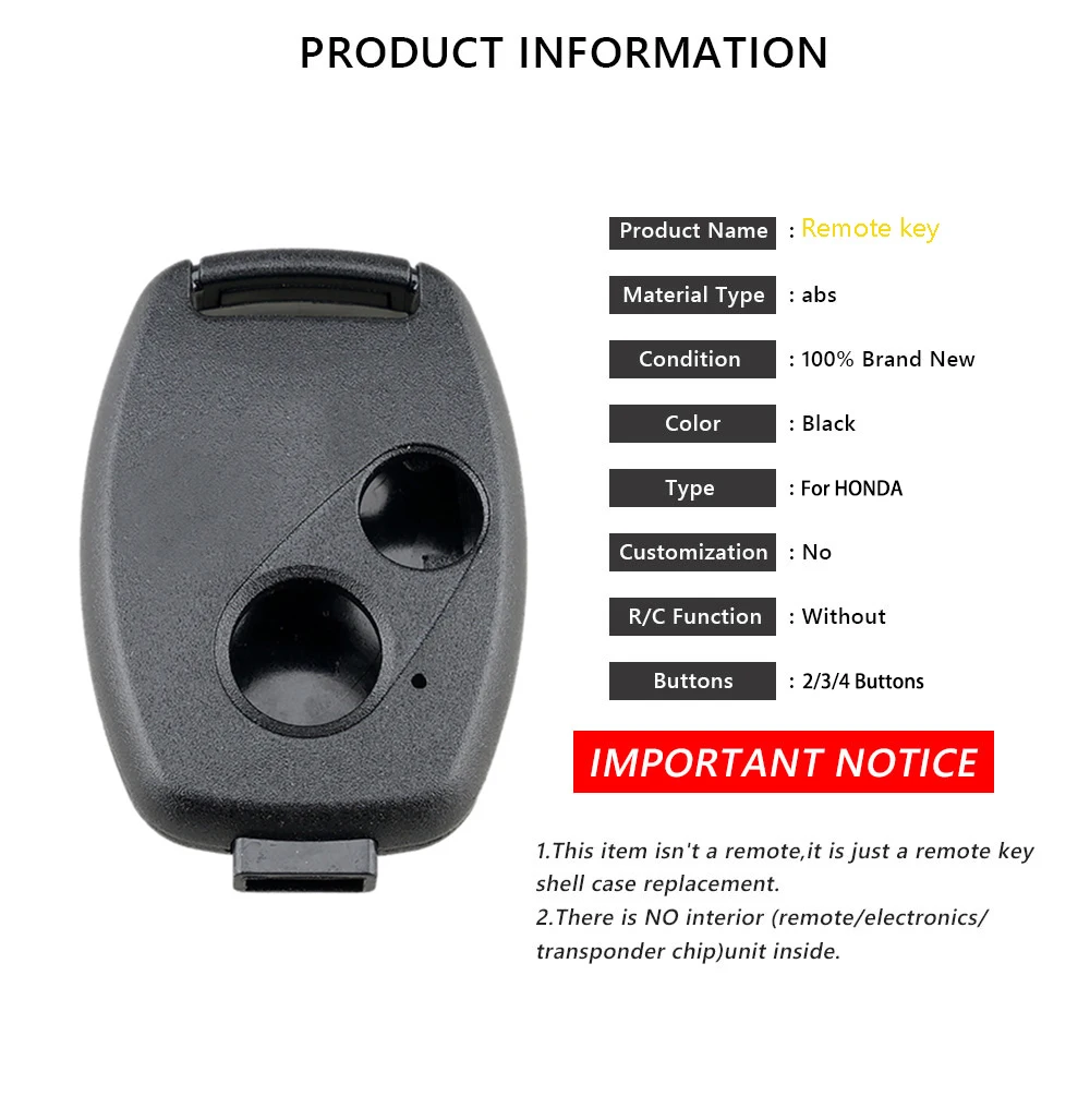 Состояние на 100% абсолютно новый и высокое качествоНаименование товара: Автомобильный ключКнопки: 2/3/4 кнопкиПустая клавиша: нетЭлектронная плата: нетАккумулятор: нетФирменный логотип/наклейка: нет (Aliexpress запрещено продавать с логотипом!)Подходит:Для HONDA Accord 2003 - 2013Для HONDA Civic 2006 - 2013Для HONDA CR-V 2005 - 2013Для HONDA Pilot 2005 - 2013Для HONDA Fit 2007 - 2013 Примечание:1. Товар является только ключом оболочки, которая без платы PCB и батареи внутри.2. Все фотографии являются реальными фотографиями, которые сделаны нами. Пожалуйста, проверьте ваш ключ оболочки, чтобы убедиться, что он такой же, как наш продукт.Посылка включает в себя: 1 * Новый чехол для дистанционного ключа