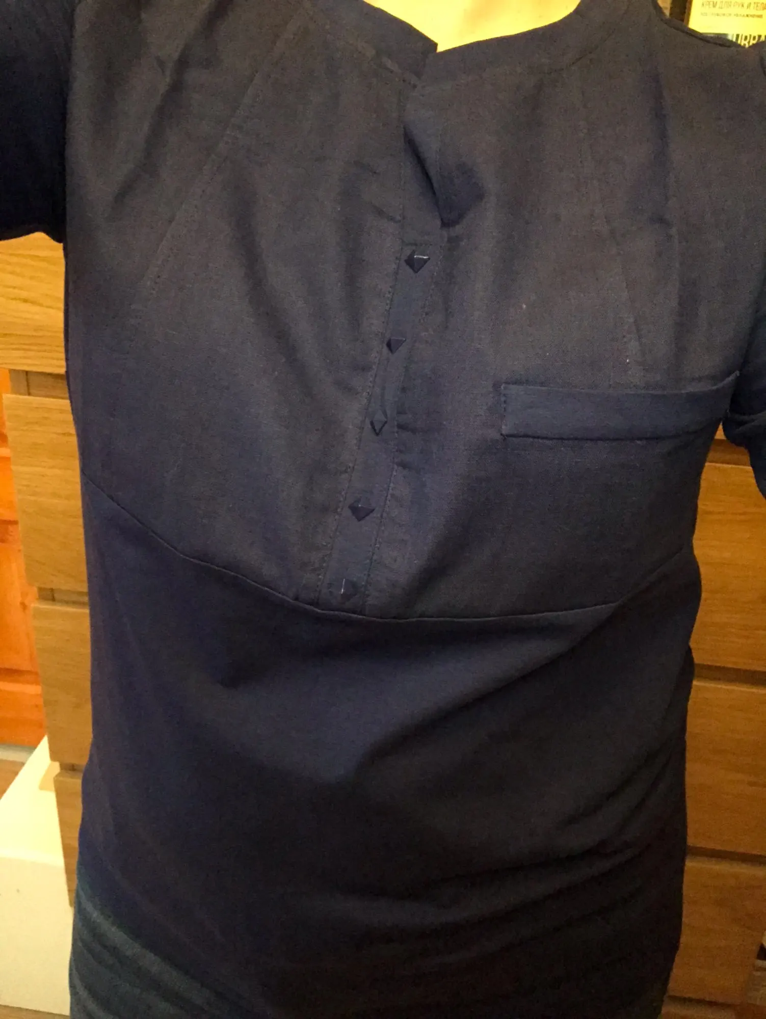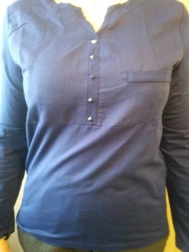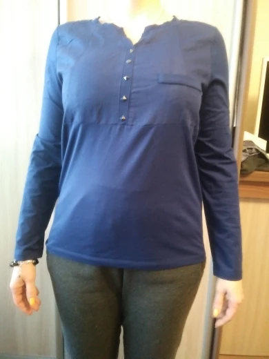 На фото футболка имеет более фиолетовый ( чернильный) оттенок.В реале- темно- синяя. К качеству претензий нет.XL на ОГ 92 и ОБ 94 в самый раз. Швы все ровные, постороннего запаха нет.Сама футболка- трикотаж с хлопковыми вставками спереди ( до места, где кончается застежка).Самой застежки нет- это иммитация.Футболка довольно тонкая, но не просвечивает.Носить скорее всего буду...Только подумаю с чем- расщитывала на др. оттенок.