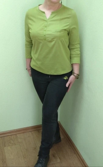 Кофточка понравилась. Села хорошо на 46-48 рос. размер, ОГ 98, ОБ 102. На рост 156 рукава и длина в самый раз) Сшита качественно. Трикотаж хлопковый, вставки спереди вверху и сзади внизу из хлопка, напоминают тонкий лен. Доставка до Москвы за 2 недели в Пятерку.