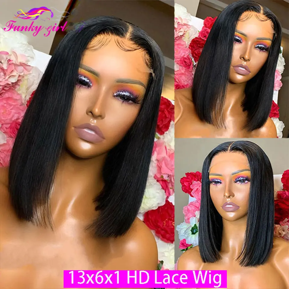 Короткие парики из человеческих волос с кружевной частью, перуанские прямые волосы, парик Боб 13x1x6, парики с T-образной пряжкой для черных женщин, плотность 150%
