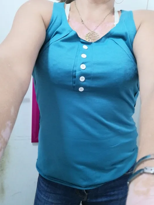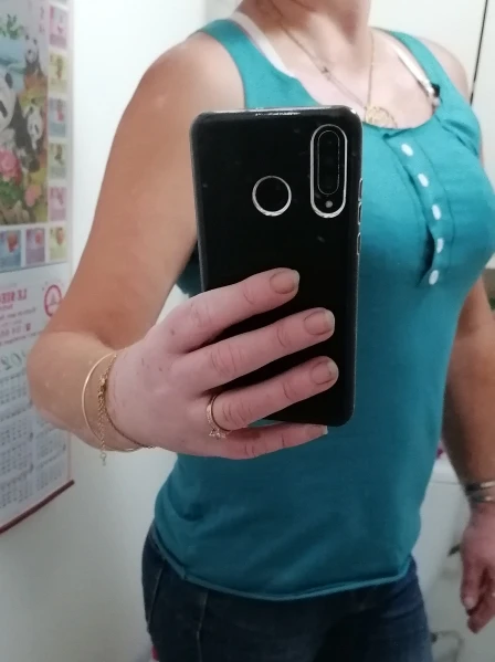 Выбрала на размер побольше, что только усугубило ситуацию, вырез меньше чем на фото, вся угловатая, торчат вырезы под руки