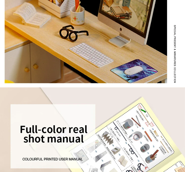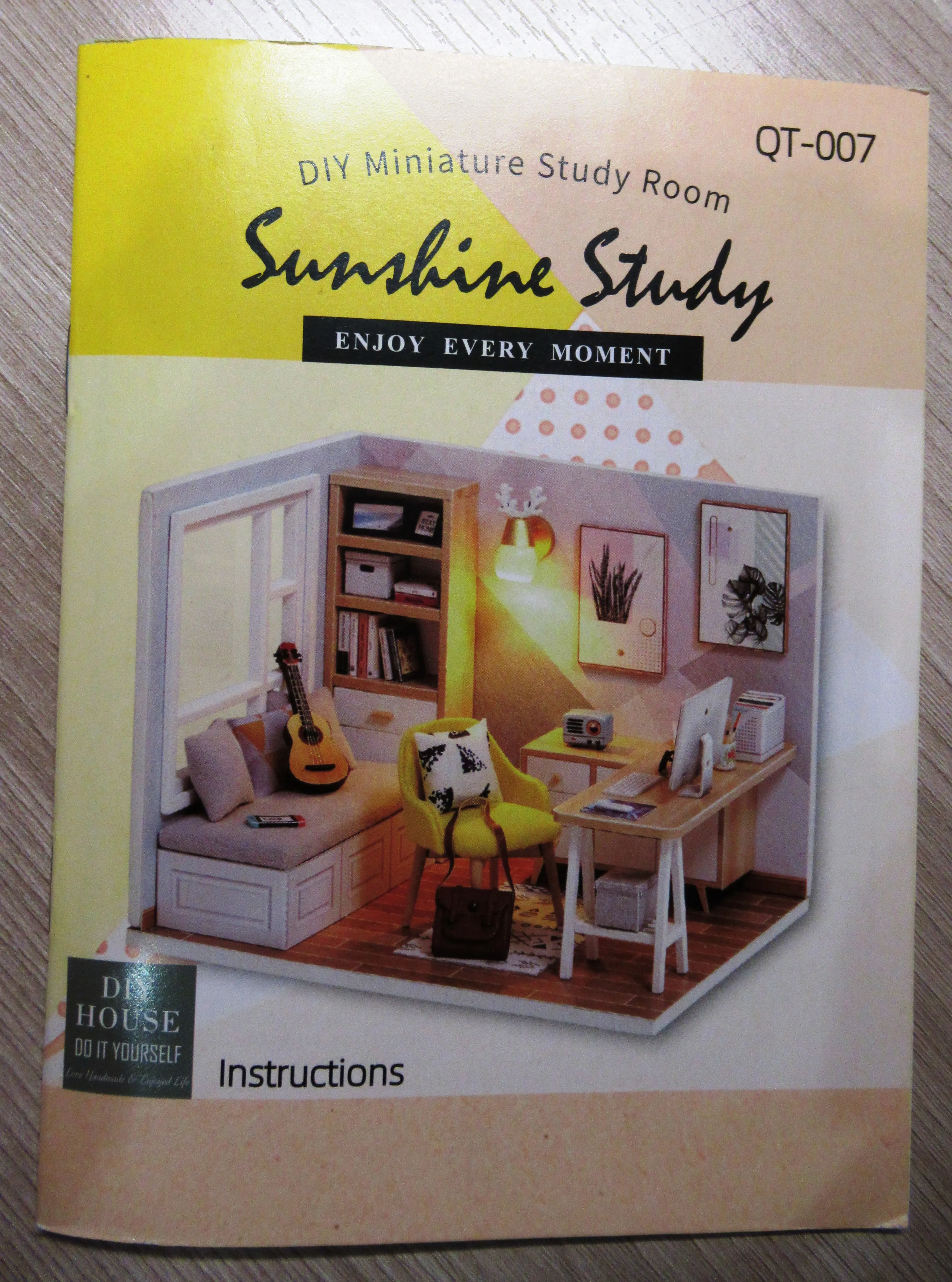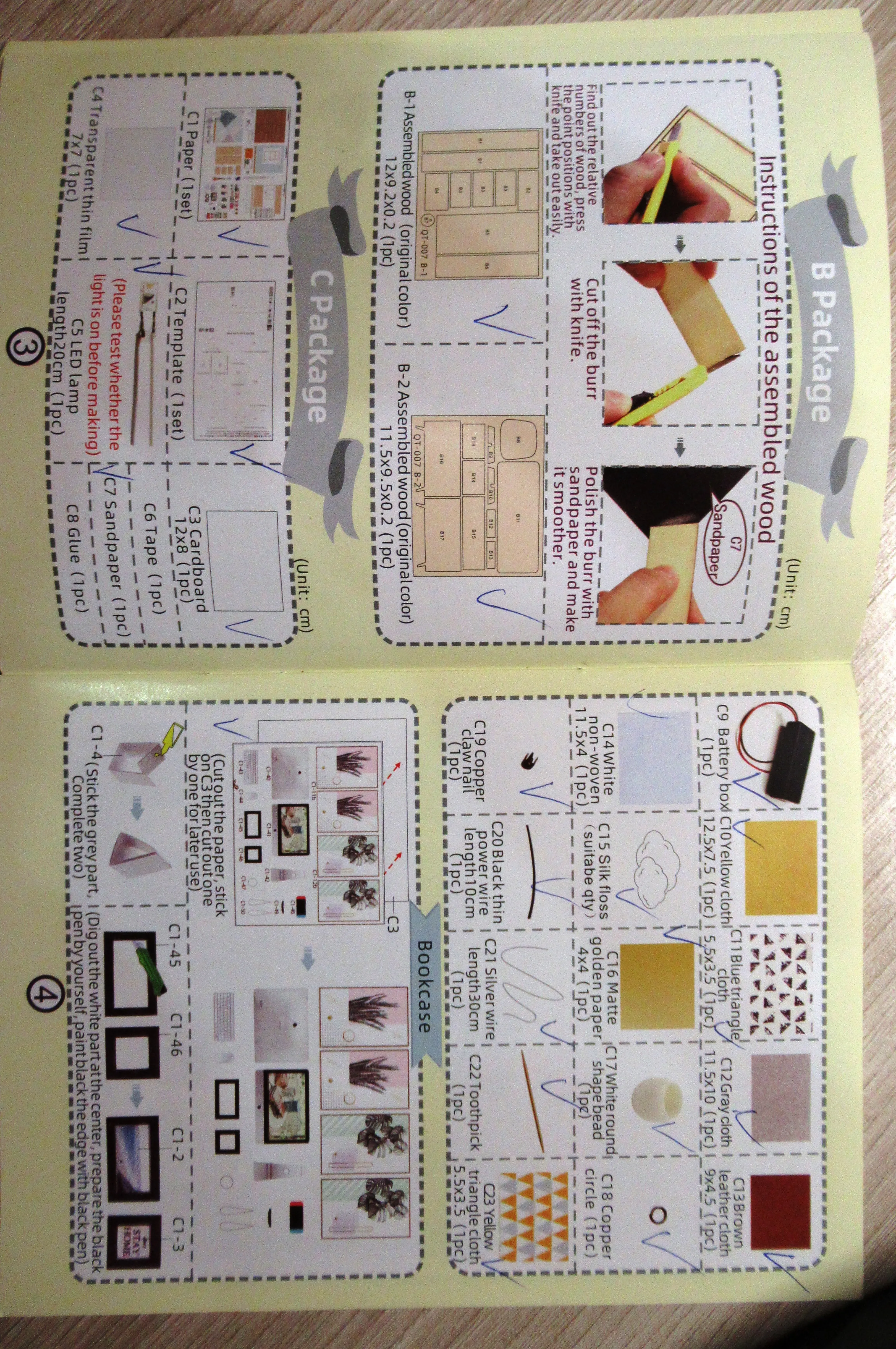 Я выбрала кукольный дом с крышкой от пыли. В этом случае в набор не входят: настольная лампа, наушники, кактус с полочкой и выдвижным ящиком а также какой то зверек типа носорога (см. картинки). Ящик для книг на столе тоже укороченный. Я, конечно, через 5 минут пожалела, но было уже поздно. В наборе есть книжка с комплектацией и последовательностью сборки на английском языке. В принципе понятно. Клея для сборки и пинцета тоже нет. Не знаю есть ли он в комплектации без защитного экрана. Светодиод (на 1 лампу) и корпус для батареек ААА есть. Коврик напольный из бумаги. Посылку отправили быстро. На мой вопрос будет ли в составе лампа и наушники продавец ответила, что будет то, что изображено на картинке. Сейчас правда она изменила картинки. Есть отличия в мелочах, вроде как на обеих картинках есть и наушники и лампа настольная. Не суть важно. Поставила 5 звезд т.к отправка была быстрая. Миниатюра получится маленькая. На картинке смотрится больше.