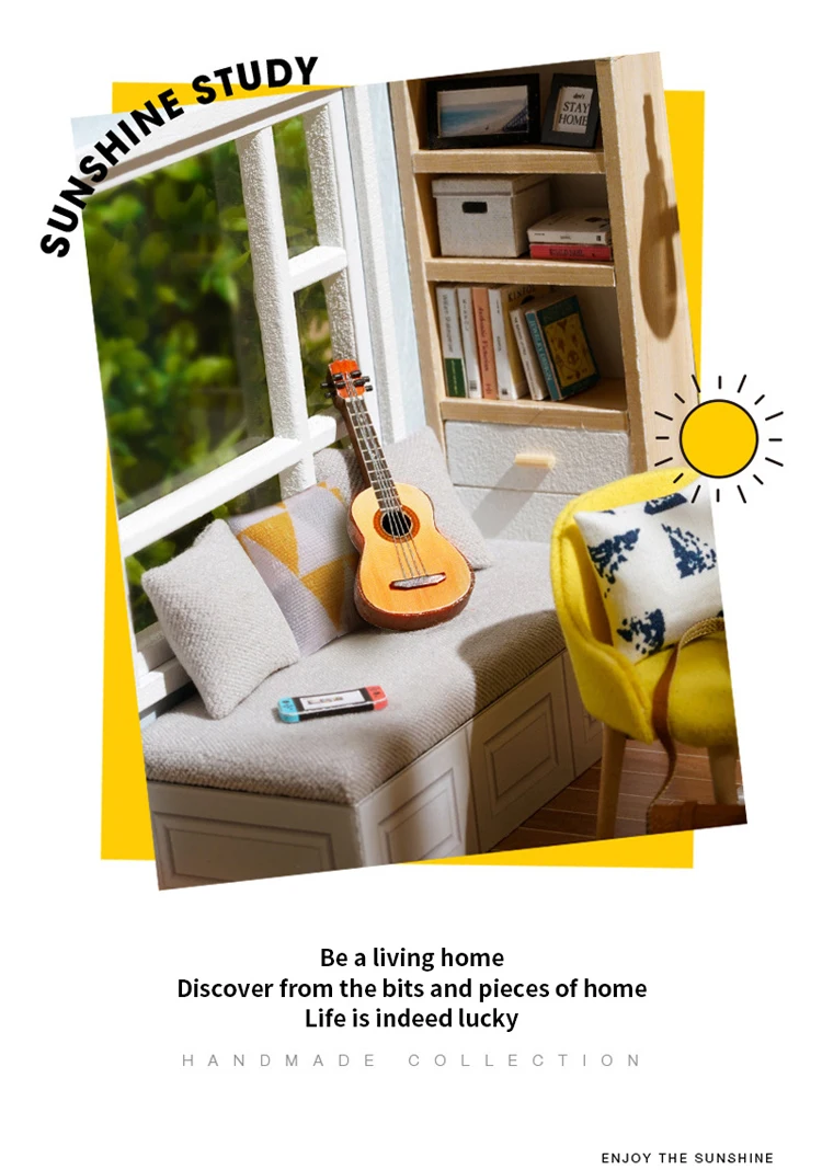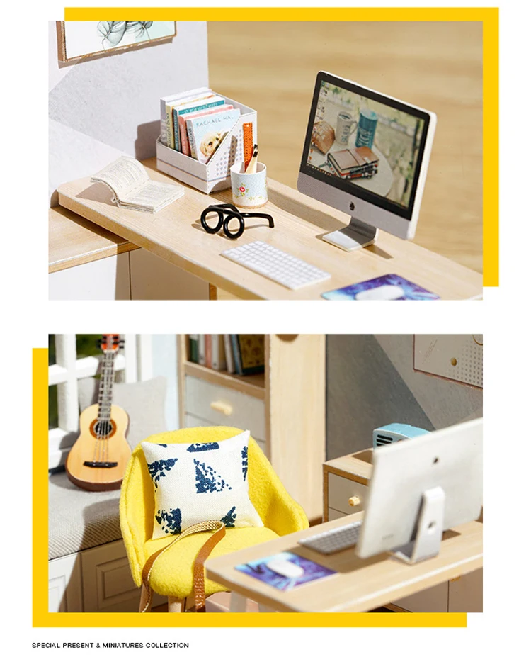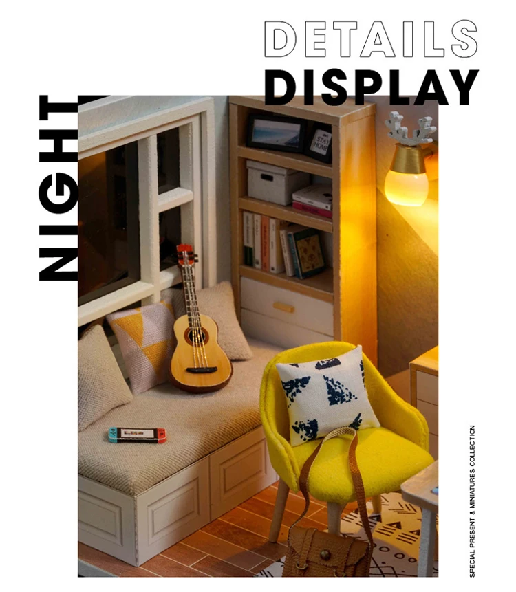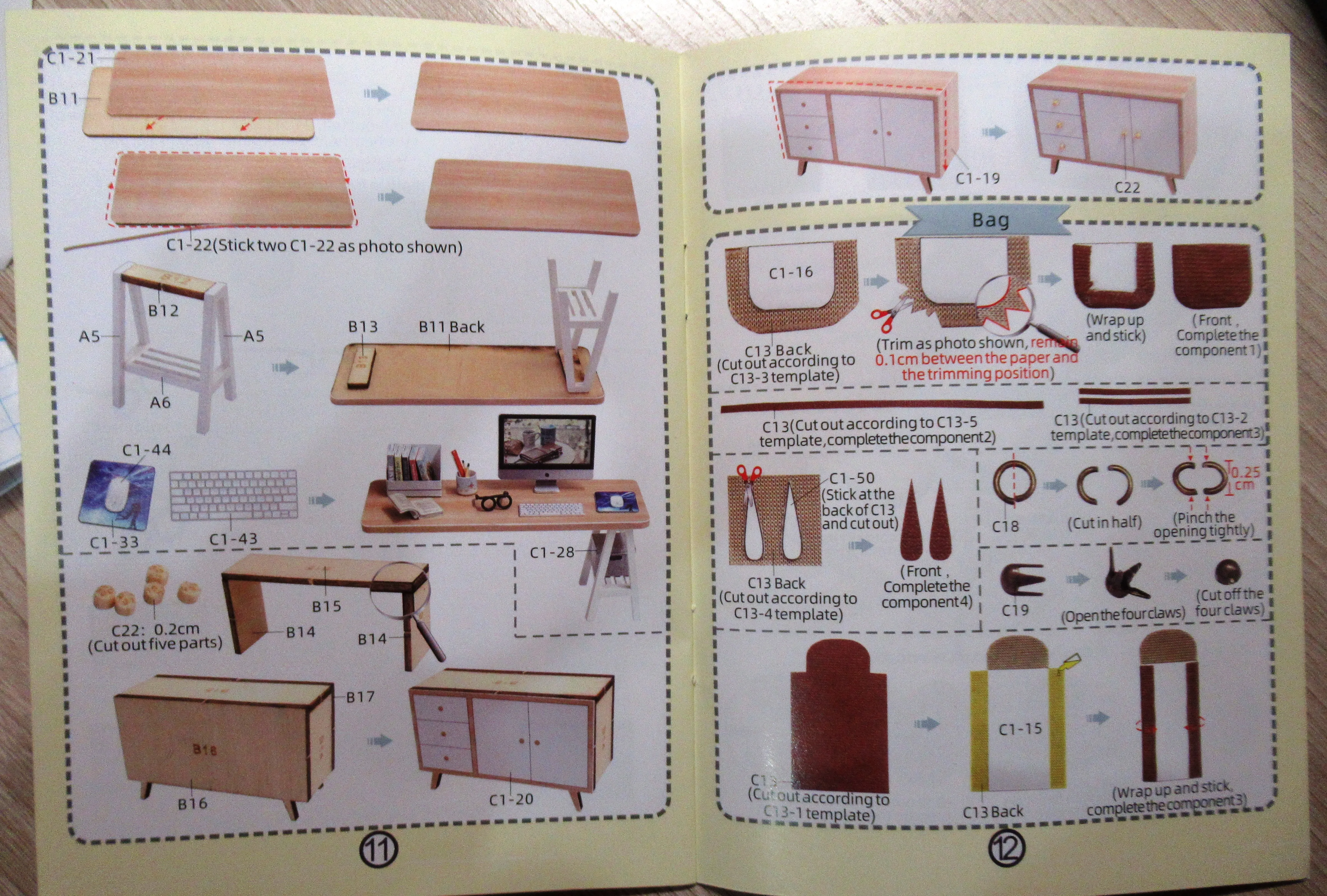 Я выбрала кукольный дом с крышкой от пыли. В этом случае в набор не входят: настольная лампа, наушники, кактус с полочкой и выдвижным ящиком а также какой то зверек типа носорога (см. картинки). Ящик для книг на столе тоже укороченный. Я, конечно, через 5 минут пожалела, но было уже поздно. В наборе есть книжка с комплектацией и последовательностью сборки на английском языке. В принципе понятно. Клея для сборки и пинцета тоже нет. Не знаю есть ли он в комплектации без защитного экрана. Светодиод (на 1 лампу) и корпус для батареек ААА есть. Коврик напольный из бумаги. Посылку отправили быстро. На мой вопрос будет ли в составе лампа и наушники продавец ответила, что будет то, что изображено на картинке. Сейчас правда она изменила картинки. Есть отличия в мелочах, вроде как на обеих картинках есть и наушники и лампа настольная. Не суть важно. Поставила 5 звезд т.к отправка была быстрая. Миниатюра получится маленькая. На картинке смотрится больше.