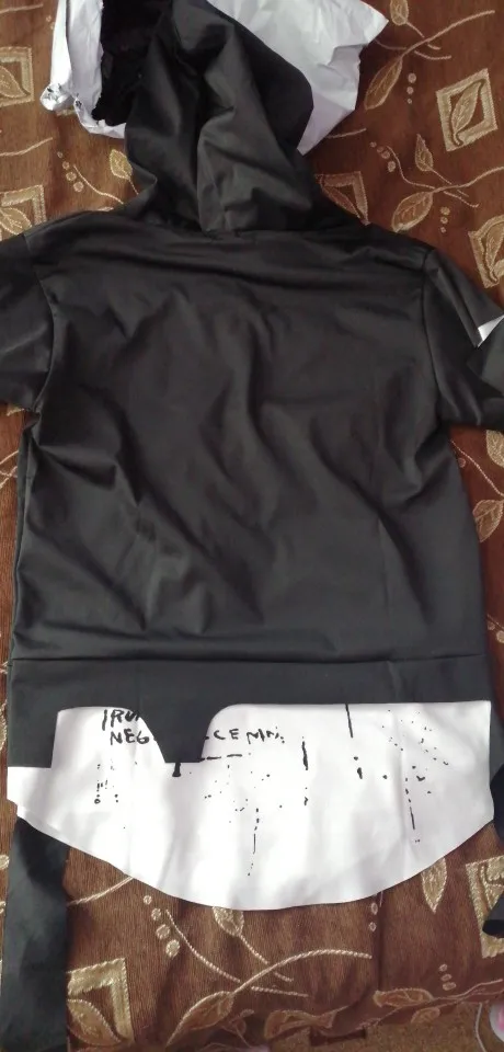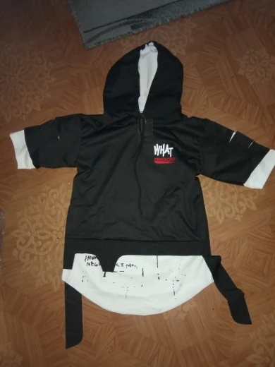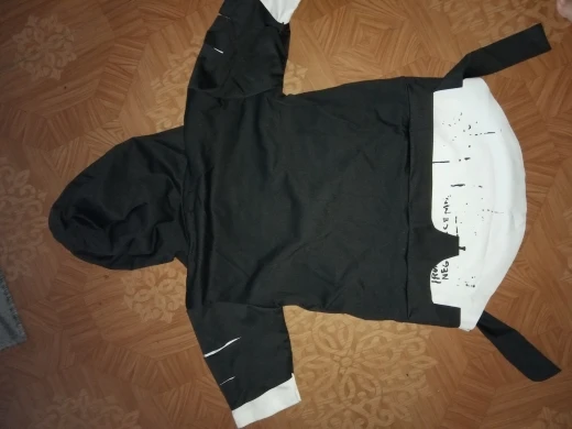 Товар соответствует описанию, брала на худенького мальчика ростом 150 см, все подошло. Кофта с капюшоном, регулируется завязками. Белый материал тонкая синтетика, черный материал - грубый хлопок, толстоватая, поэтому кофта в целом не тонкая. Трек отслеживался, прошито все отлично. рекомендую!