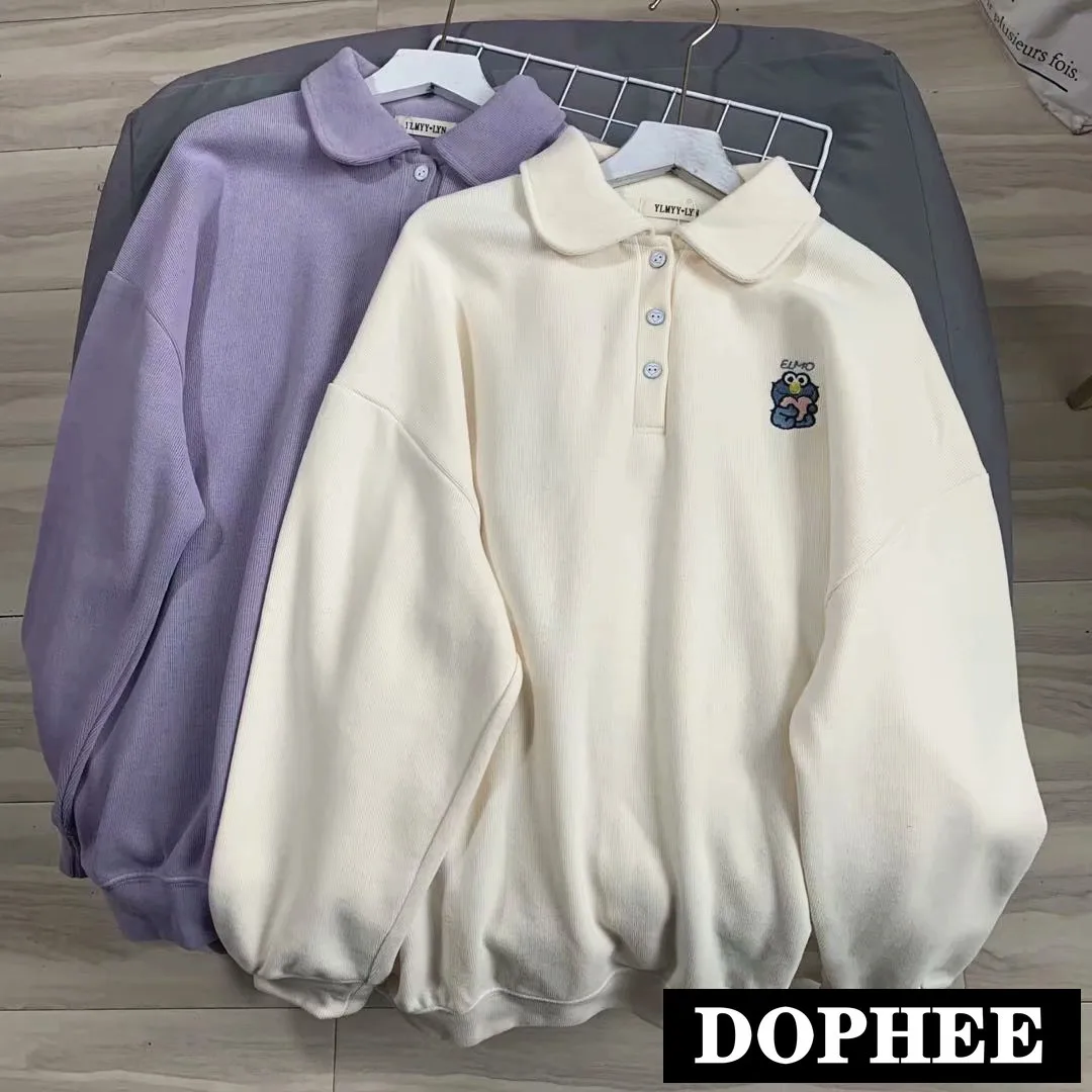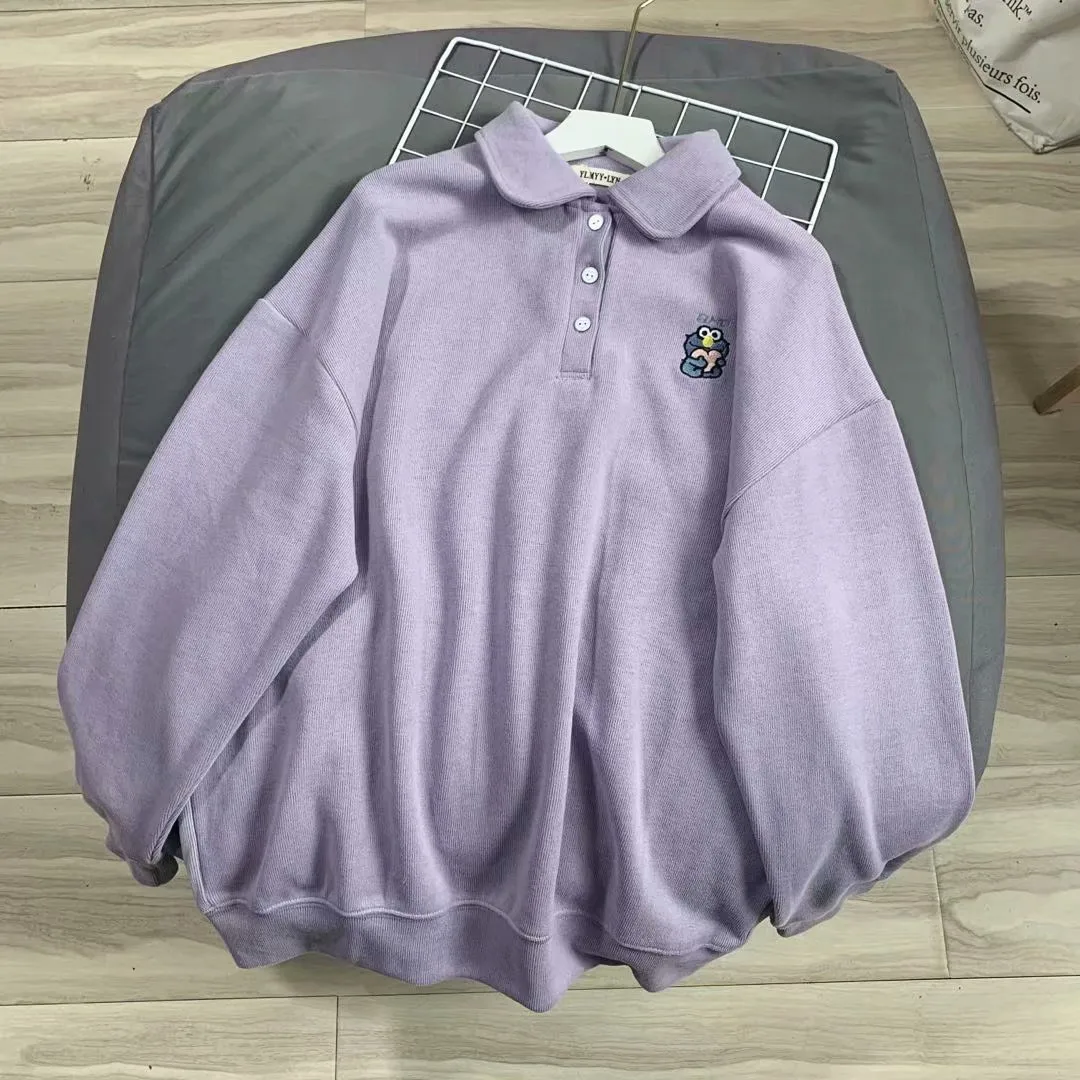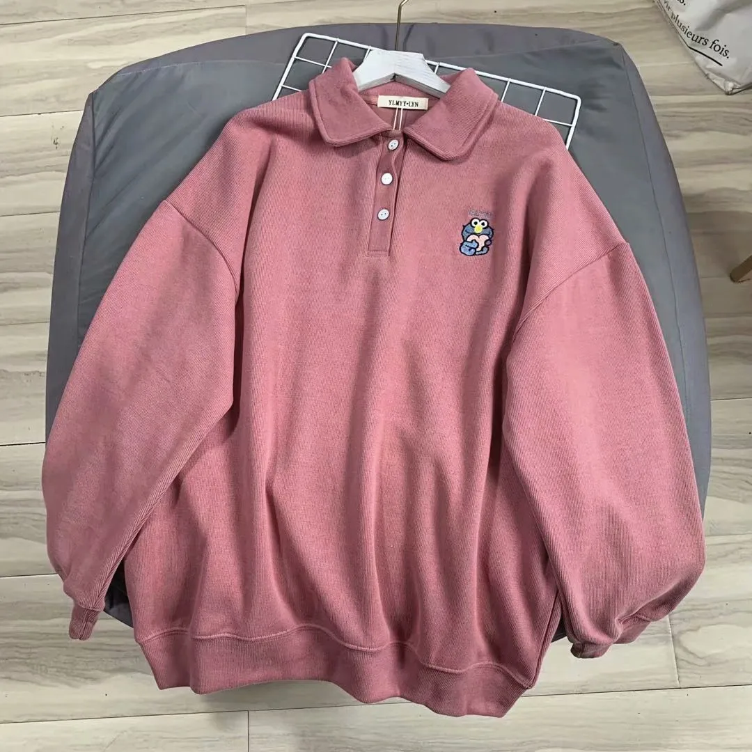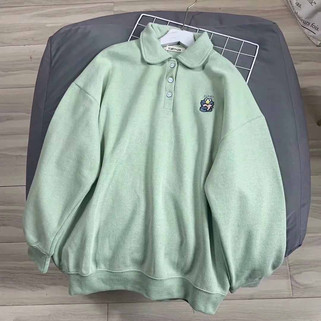 Женский хлопковый свитшот с длинным рукавом, свободные худи для студентов с воротником поло и вышивкой лягушки, весна-осень