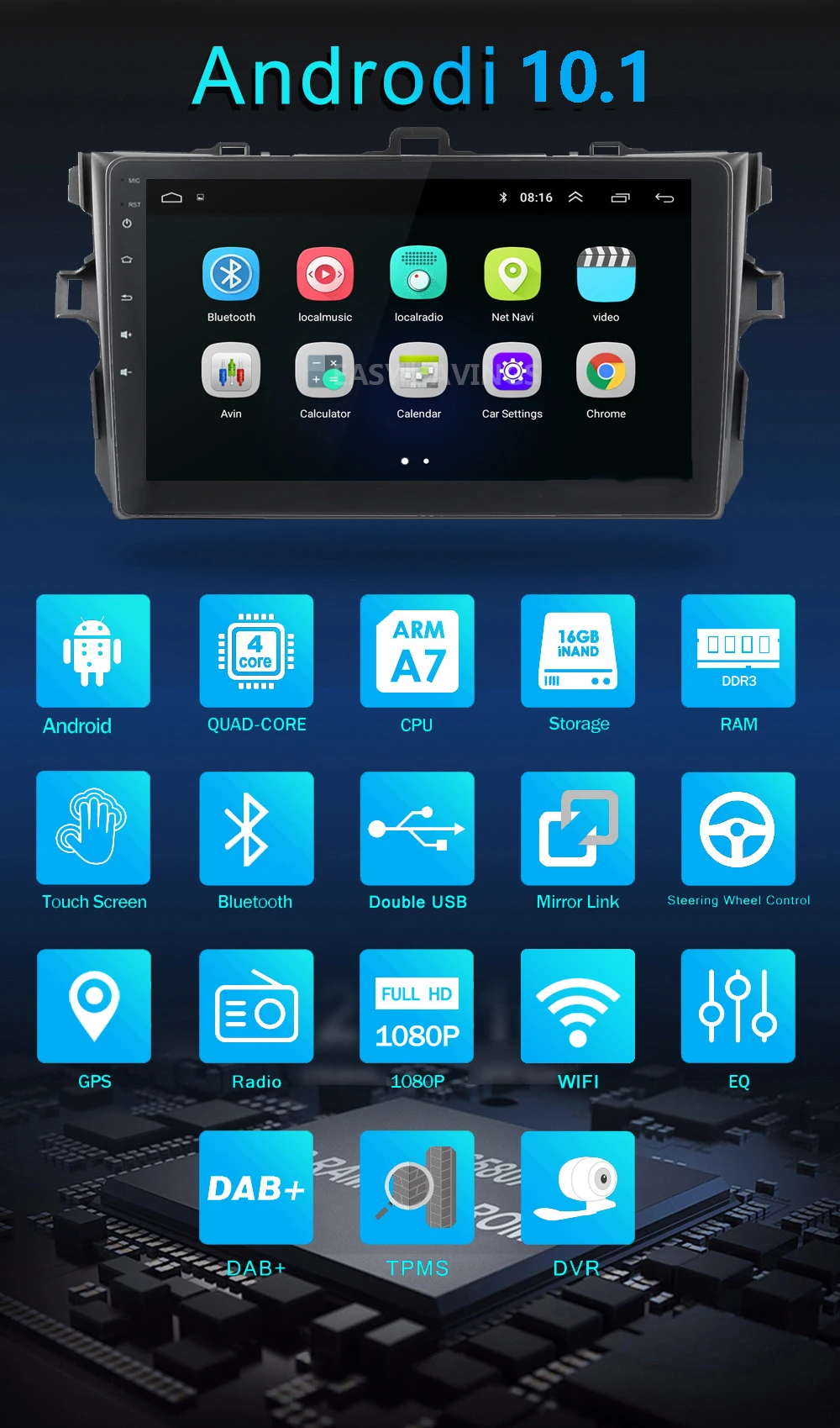 2Din android 10,1 автомобильный радиоприемник, стерео мультимедийный плеер для Toyota Corolla E140/150, 2007, 2008, 2009, 2010, 2011, 9 дюймов, GPS-навигация, 2 din