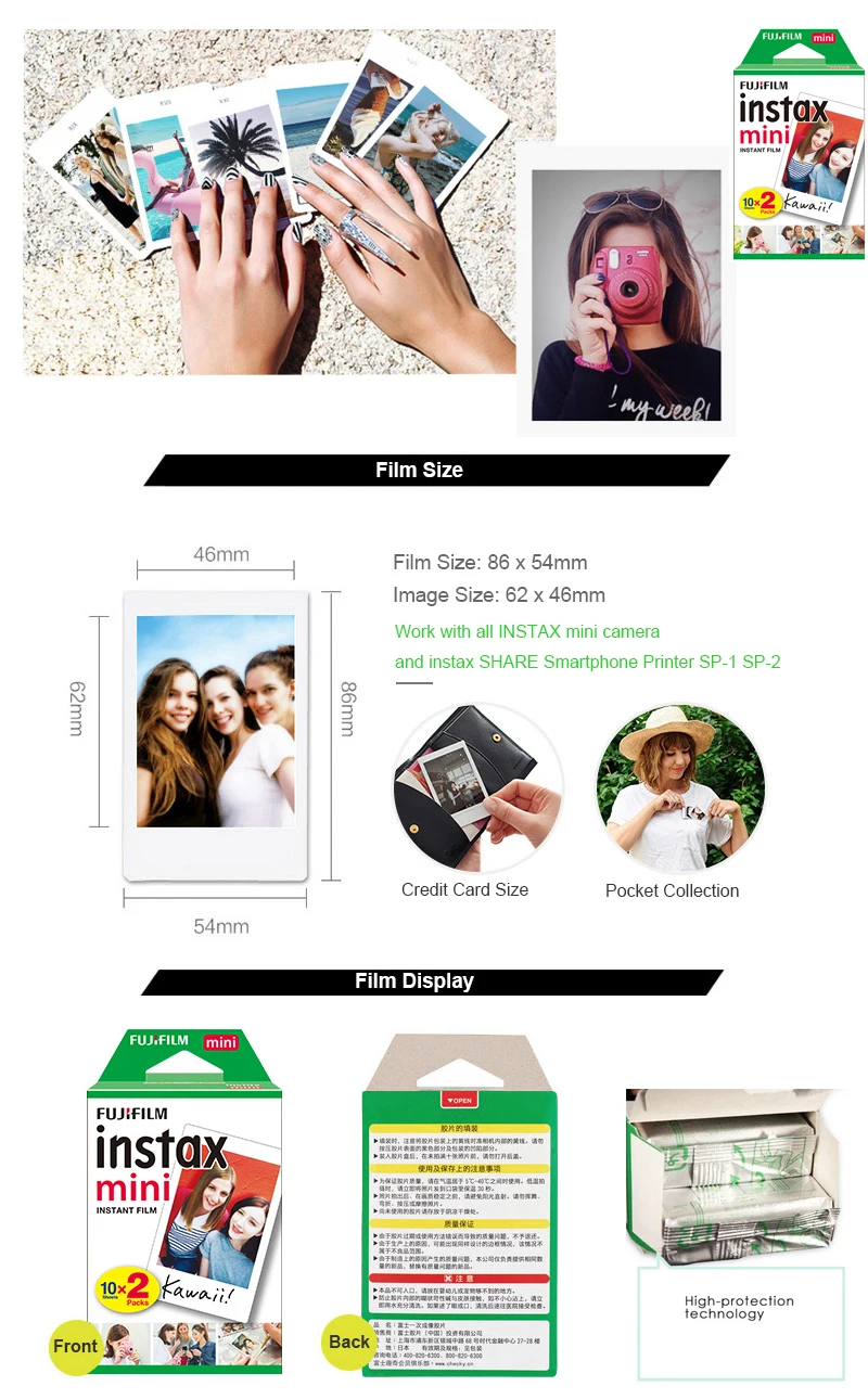1. Совместим с моментальной камерой Fujifilm Instax Mini 11 9 и полной линейкой камер Fujifilm Instax Mini 8, Mini 90, Mini 70, Mini 50S, Mini 25, Mini HELLO KITTY, И фотокамеры моментальной печати Polaroid PIC 300, принтер Instax Share Liplay, SP1, SP2.2. Эта мгновенная пленка Fujifilm INSTAX mini оснащена высокоскоростным стандартом ISO 800 с превосходным качеством зерна, пленка Instax Mini обеспечивает яркий цвет и естественный оттенок кожи.3. Эти мини-пленки Instax имеют размер кредитной карты-5,4x8,6 см (размер пленки)-Уникальный чехол для кредитных карт размера d легко носить с собой в сумочке или кошельке и имеет классическую белую рамку, которую вы можете оставить пустым или персонализировать с помощью веселых сообщений.4. Запечатлейте ваши моменты и сразу Наслаждайтесь изображением. Все, что вы делаете, это нажимаете на затвор, запечатлеваете момент, и смотрите, как фотография выскользнет и изображение развивается на глазах!
