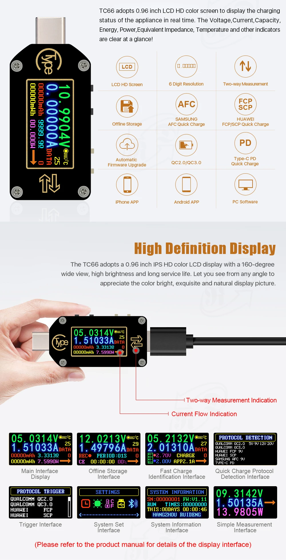 TC66/TC66C TC64 тип-c PD триггер USB-C Вольтметр Амперметр Напряжение 2 способ измеритель тока мультиметр PD зарядное устройство батарея USB Тестер