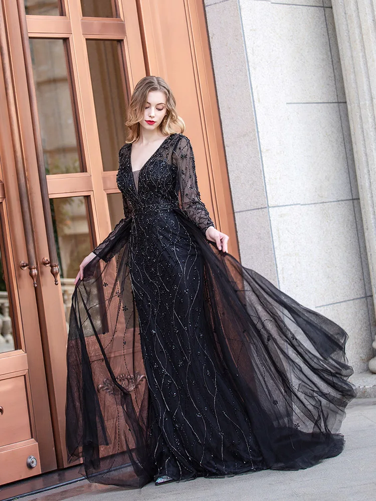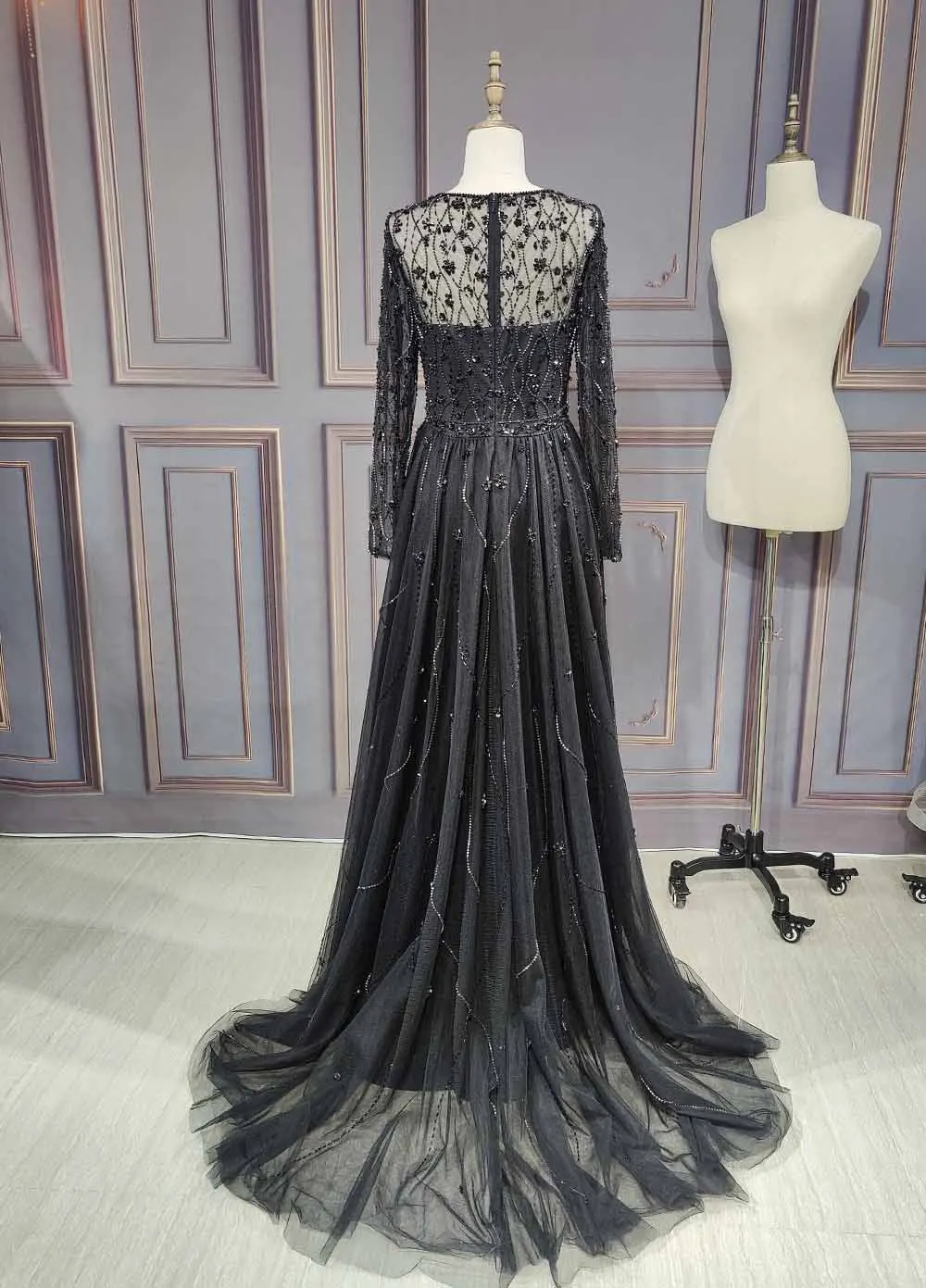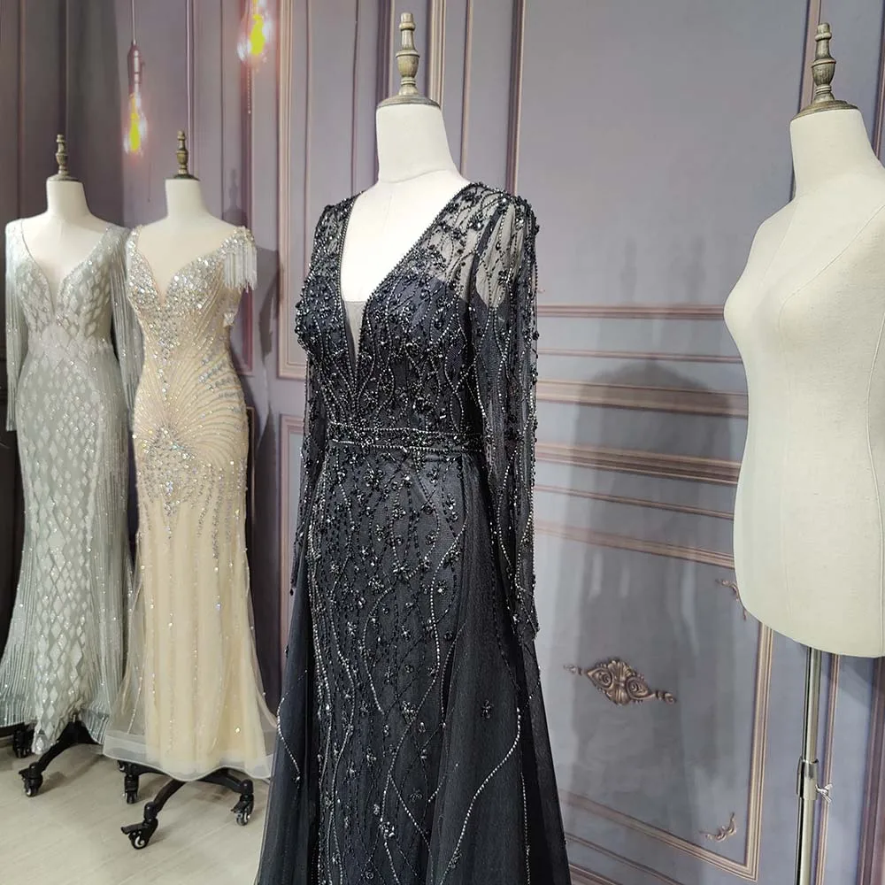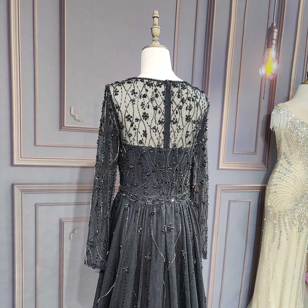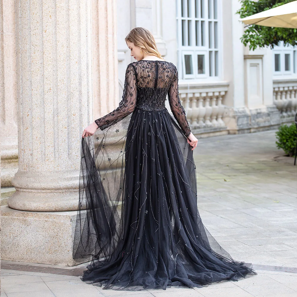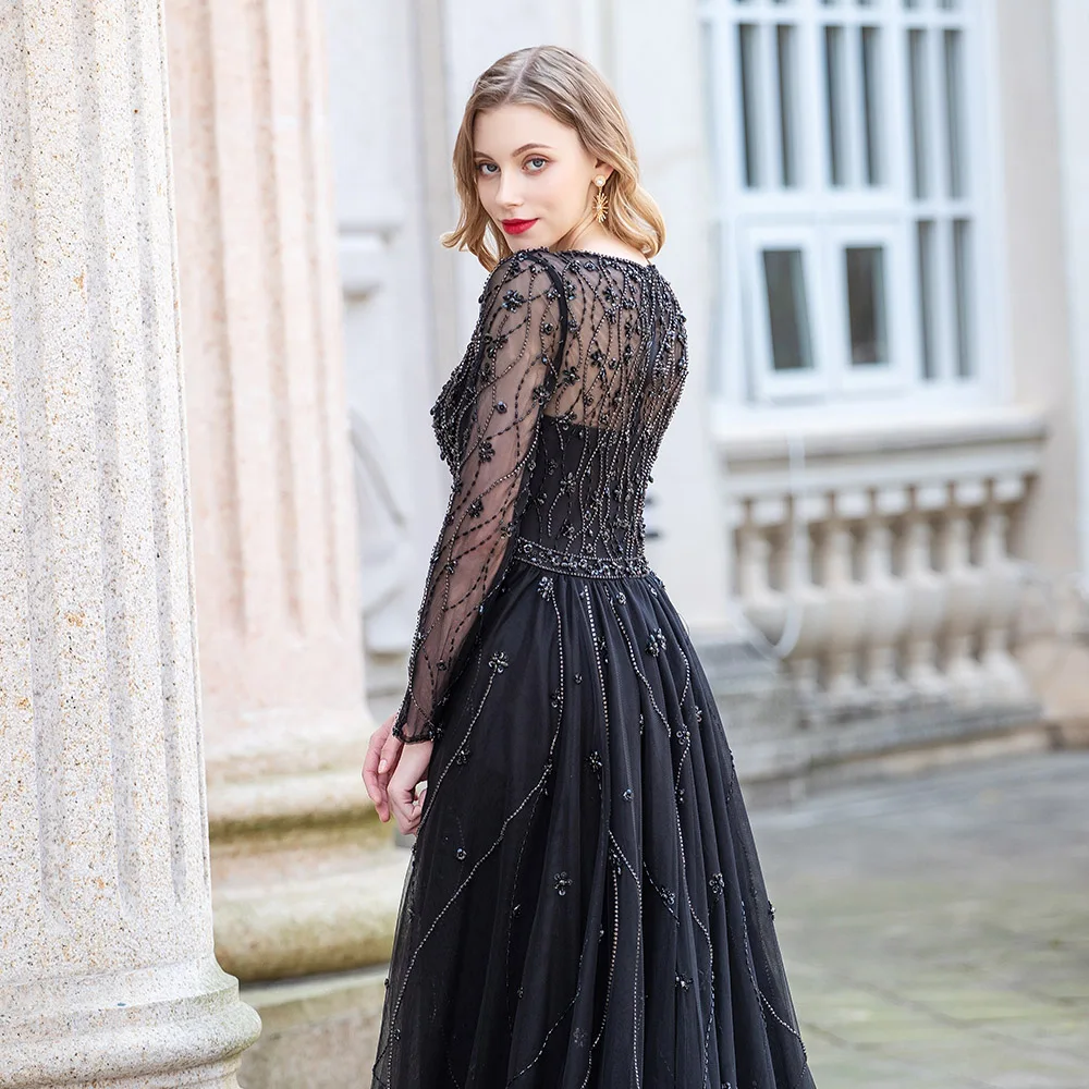 Мусульманское Черное вечернее платье с длинным рукавом и бриллиантами, v-образный вырез, тюль, бисерное вечернее платье, Дубай, женское платье на заказ