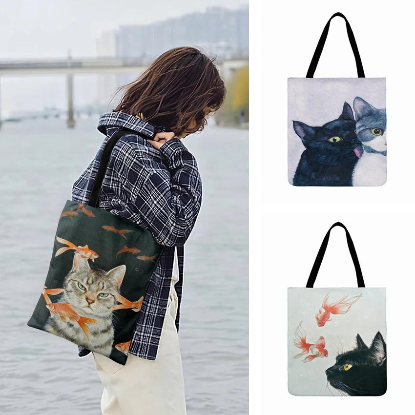Женская сумка на плечо, черная кошка, рыба, рисунок, принт, сумка-тоут, мультяшный котенок, Женская Повседневная Сумка-тоут, пляжная сумка, сумка для покупок