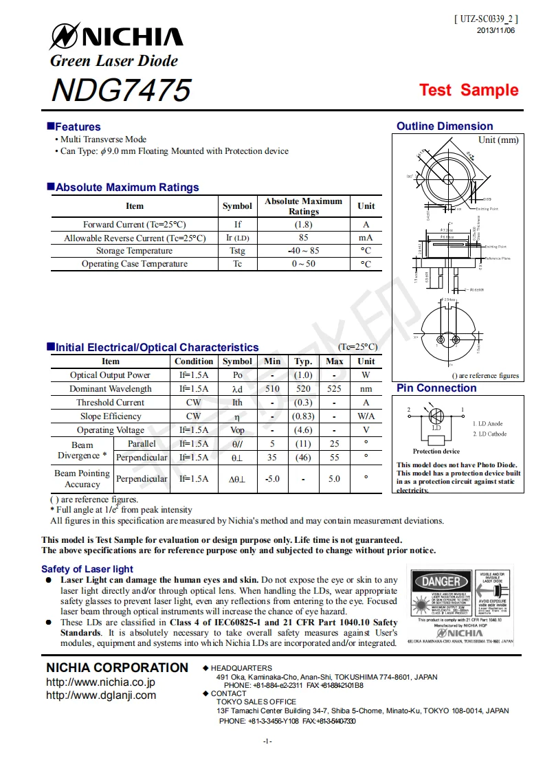 Лазерный диод NICHIA NDG7475, зеленый, 520nm, 1 Вт, 1000 МВт, для лазерных модулей RGB