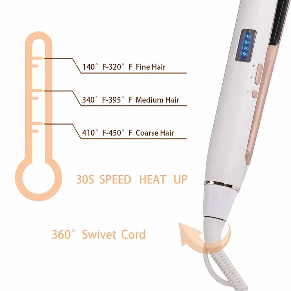Профессиональный Выпрямитель для волос, светодиодный керамический дисплей, пластина с покрытием, ионная Плойка для завивки, chapinha, плоский инструмент для укладкиОсобенностиНовейший светодиодный дисплей, легко регулировать температуруНовые керамические нагревательные панелиЛиния питания может поворачиваться на 360 градусовРегулирование температуры 100-230Профессиональный дизайн для предотвращения ожоговЭкологический материал, высокое качество АБСБыстрая температура, индивидуальный стильПродавец будет использовать новую коробку для упаковки вашего продукта, поэтому, пожалуйста, не беспокойтесь о повреждении100% новый и оригинальныйУпаковка подарочной коробки, независимо от того, как использовать, не повредит волосы