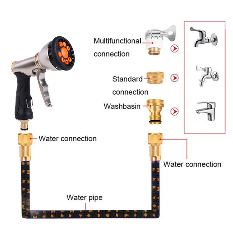 Изделие очень хорошего качества, царапины и наконечники сделаны из металла. Различные трансляции адаптируются ко всем ситуациям. Идеально подходит для полива цветов, травы, мытья машины или как садовая душа! Щелчок позволяет протекать воду при необходимости.