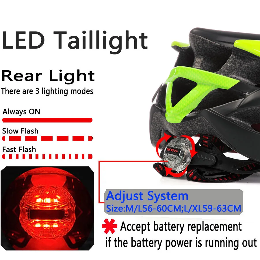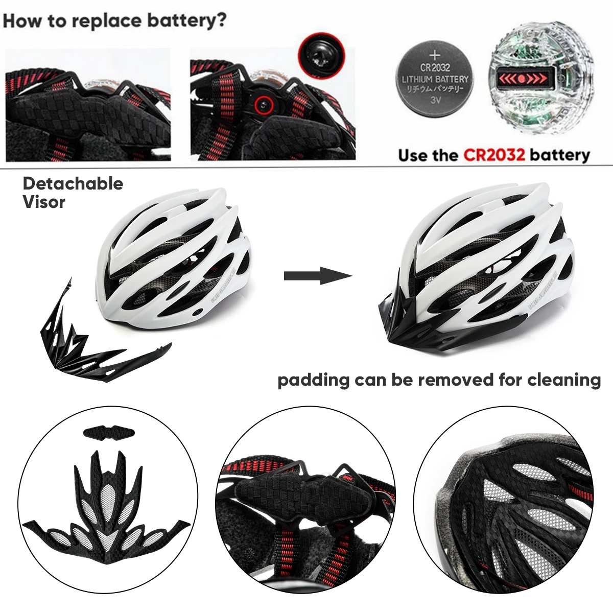 Спецификация:1: возраст: взрослые мужчины и женщины2: козырек: Да3: светодиодный светильник в трех режимах4: Материал: снаружи: поликарбонат + Эпс5: Вес: Сверхлегкий, около 210 г6: Цвет: красный, черный, белый, зеленый, титан и другие цвета7: Размер: M/L: 56-60 см (22,047-23,622 дюйма), XL:59-63 см (23,228-24,803 дюйма)Со съемным козырьком для различных видов деятельности на велосипедеШлем MTB с козырьком подходит для катания на горных велосипедах.И подходит для езды на велосипеде без козырька.Козырек крепится прочно и легко снимается только вручную.