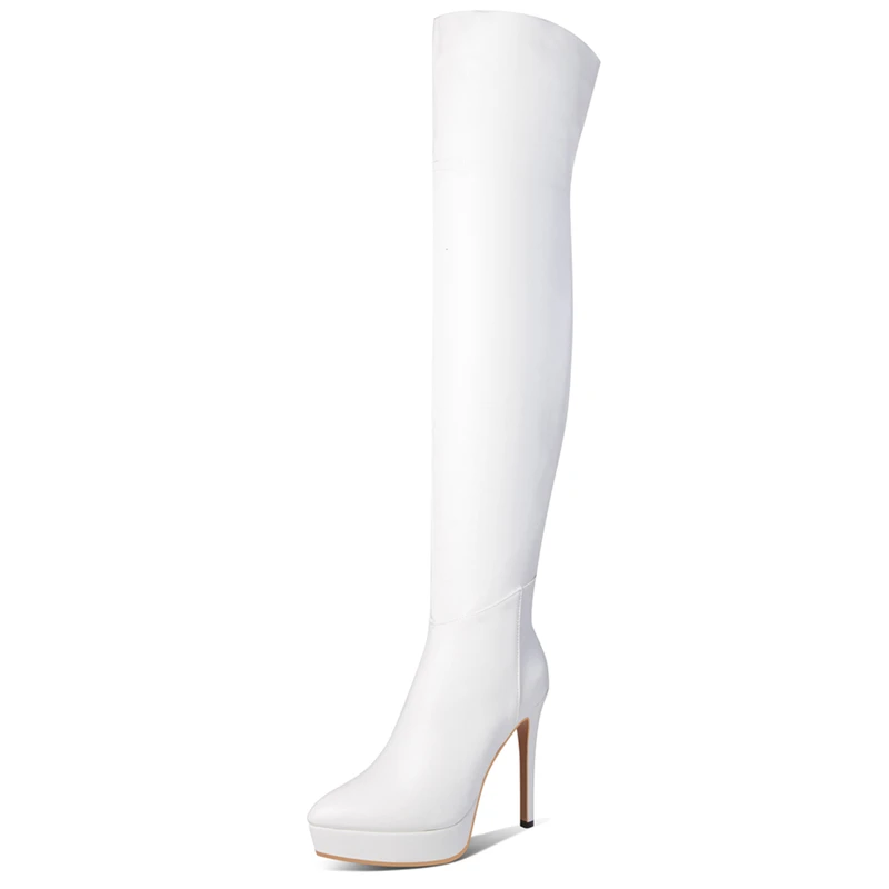 Женские сапоги выше колена, черные, белые сапоги на платформе и тонком высоком каблуке, большой размер, для осени и зимы