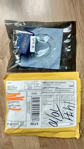 Посылка пришла в целости, многие писали о повреждении диска с ПО, но тут всё нормально. На пакетике наклейка V 1.5. Сразу испытал, к Приоре 2009 года подключился сразу, ЭБУ распознал автоматически программой Open Diag, на Torque тоже всё работает