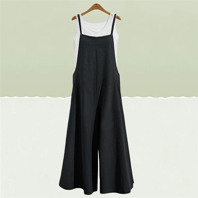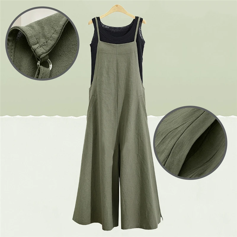 Осенне-летний женский однотонный комбинезон, повседневный комбинезон на бретельках с широкими штанинами, свободные хлопковые льняные пляжные комбинезоны размера плюс