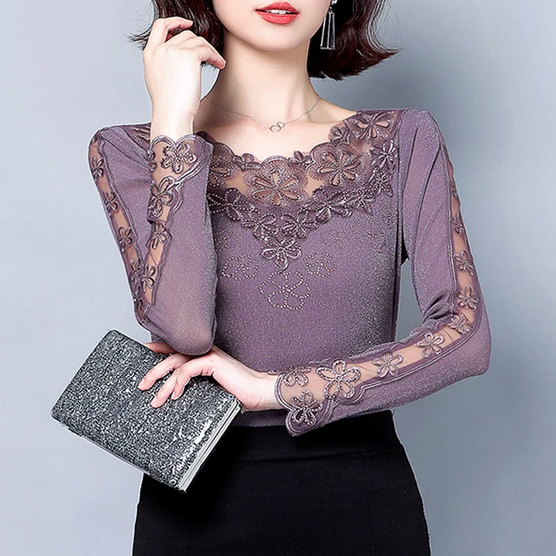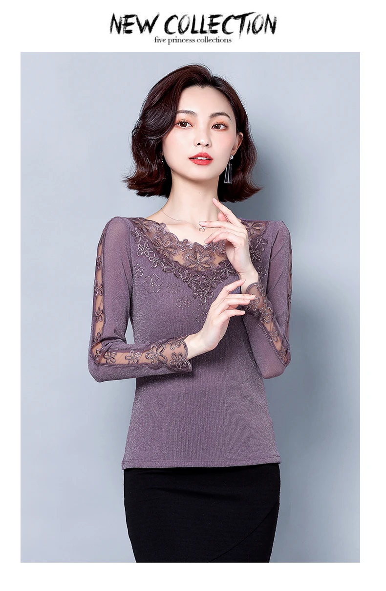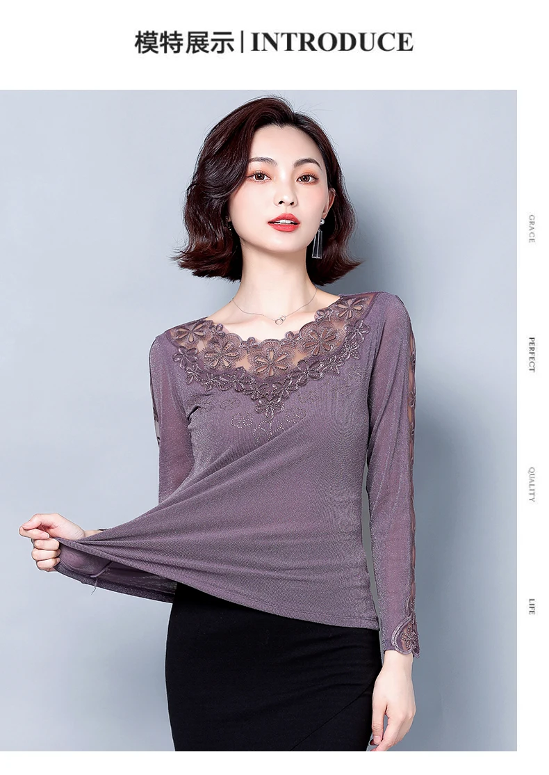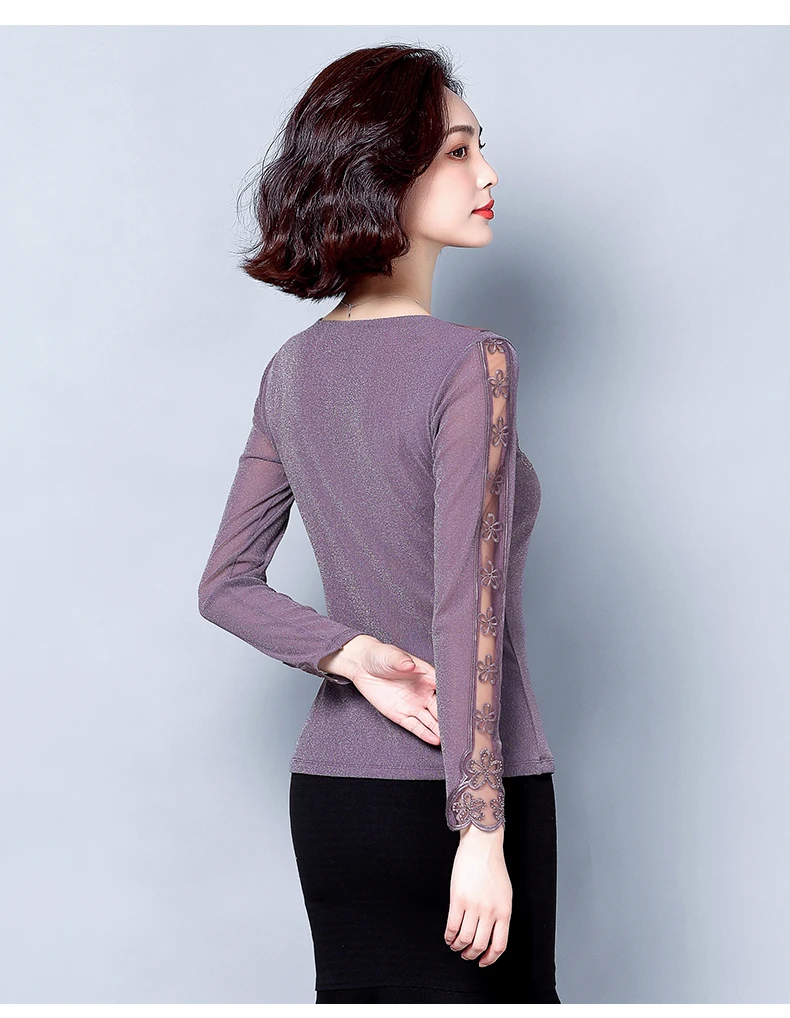 Женская Кружевная футболка с длинным рукавом и круглым вырезом