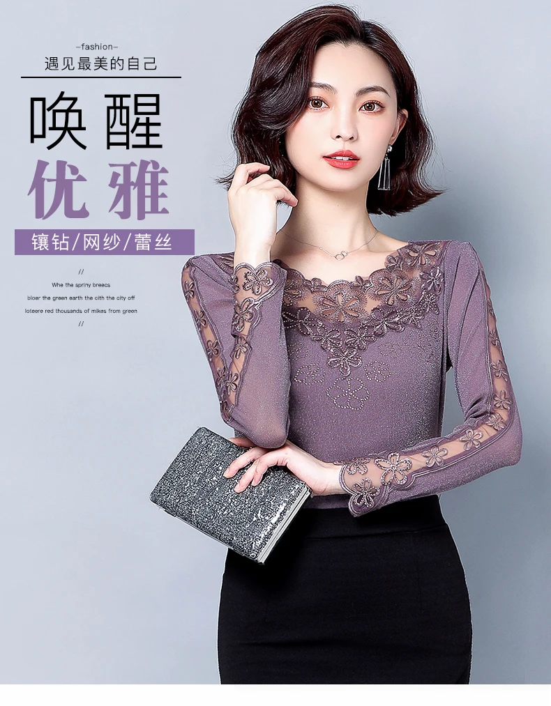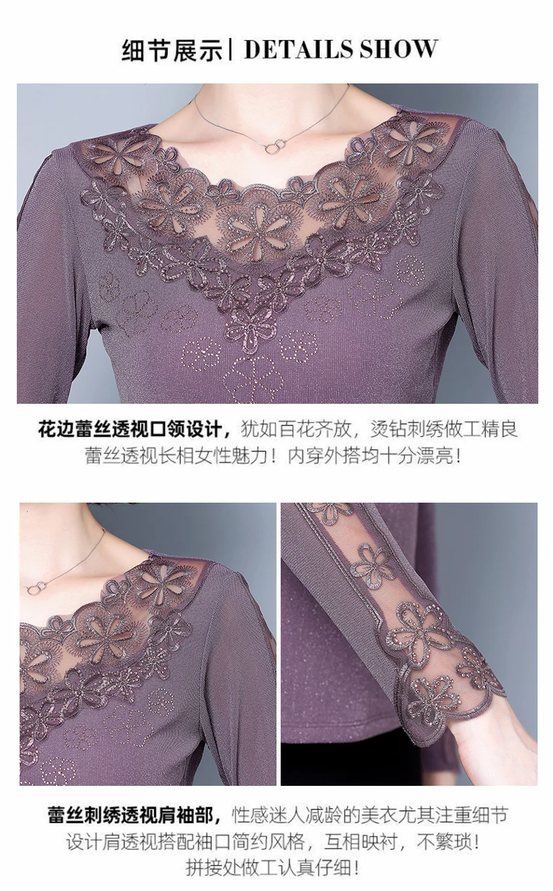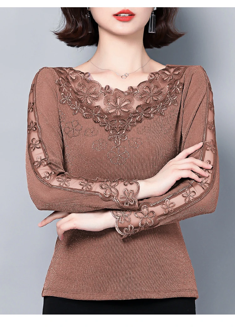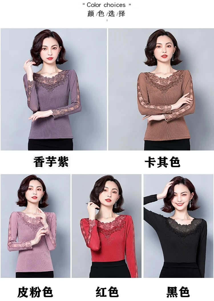 Женская Кружевная футболка с длинным рукавом и круглым вырезом