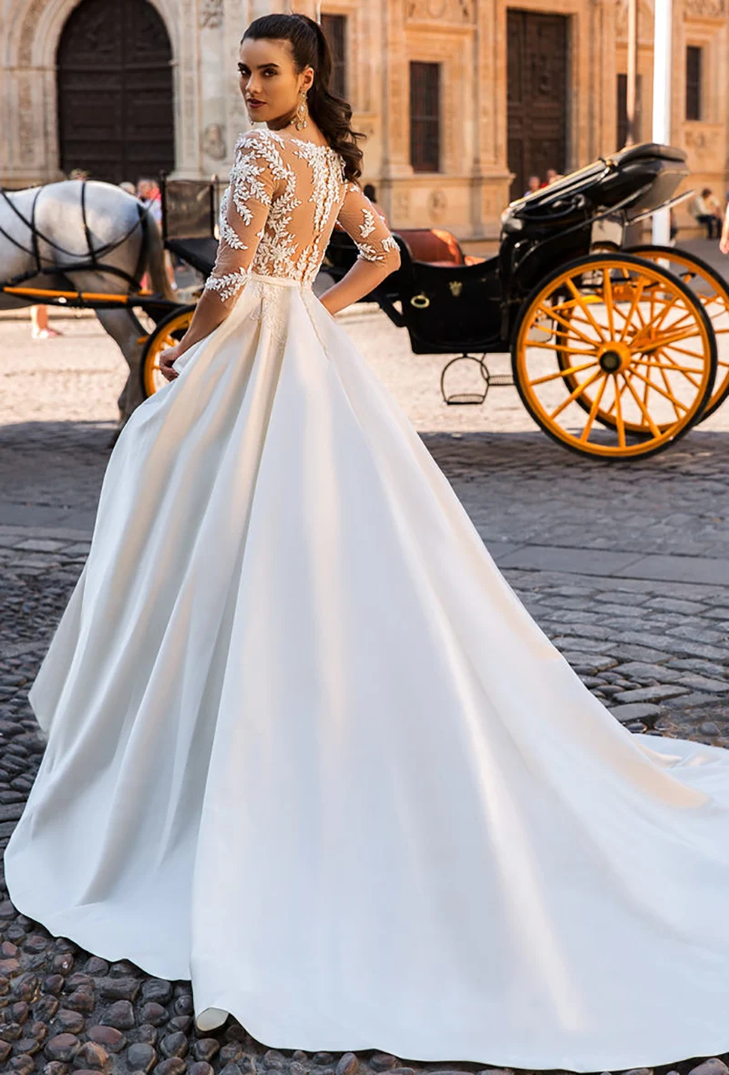 Бальное платье Sevintage с коротким рукавом, атласное свадебное платье с аппликацией, кружевное свадебное платье на пуговицах, со шлейфом, для невесты, вечерние наряды