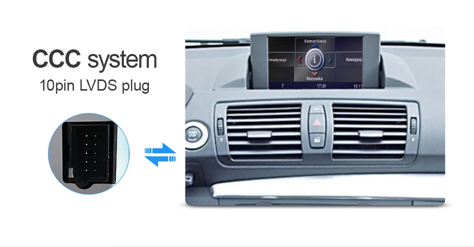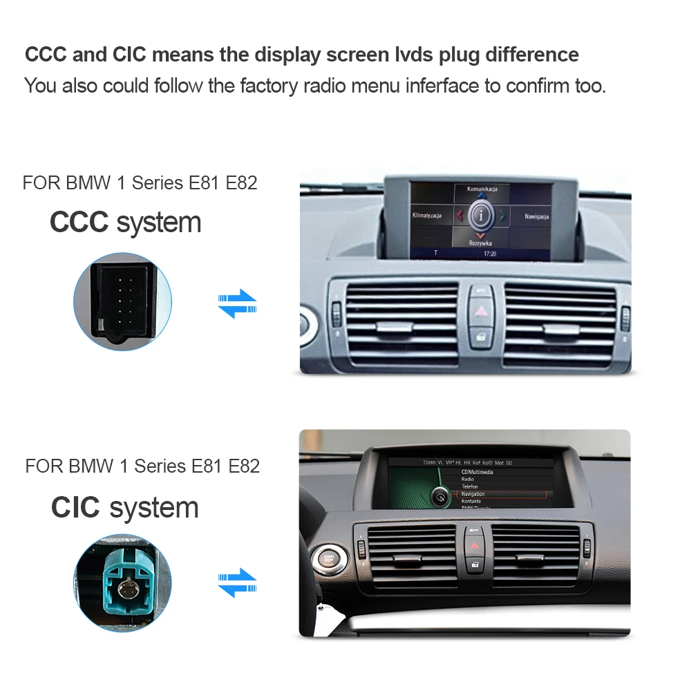 >>> Note: CCC and CIC just have display screen lvds plug difference,the rest are the same.>>>Follow the car year or original Factory head unit screen Menu to choose right one.>>>CCC means the display LVDS plug is 10pin >>>CIC means the display LVDS plug is 4pin>>>For BMW E81 E82 E87 E88 (2005-2012) Original car without screen>>>For BMW E81 E82 E87 E88 (2005 -2012 ) Original car CCC system>>>FOR BMW 3 Series E90 E91 E92 2005-2008 CCC >>>For BMW E81 E82 E87 E88 (2005 -2012 ) Original car CIC system