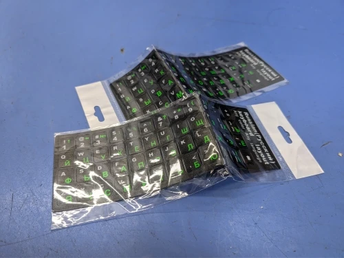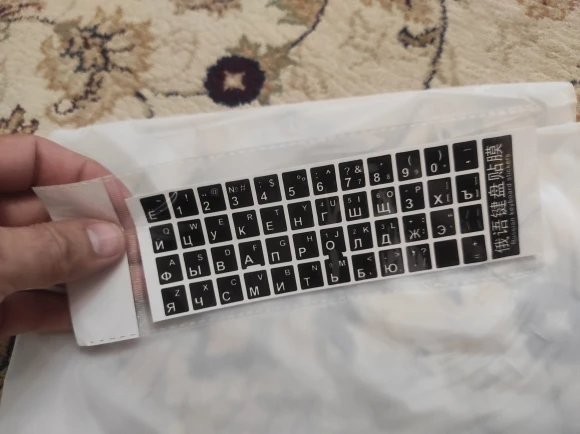 Качество на высоте, приятные на ощупь наклейки. Держатся на клавишах хорошо. Жирный шрифт комфортен для глаз.