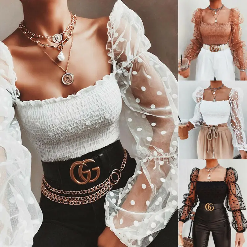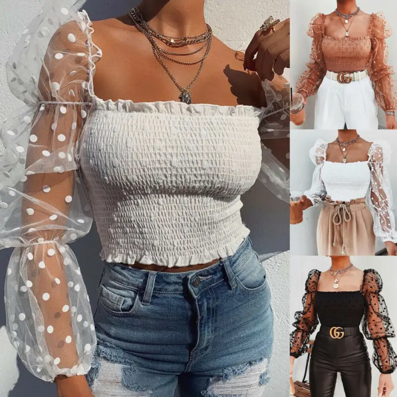Сексуальная Женская кружевная прозрачная блузка в горошек с квадрат...