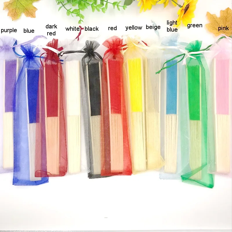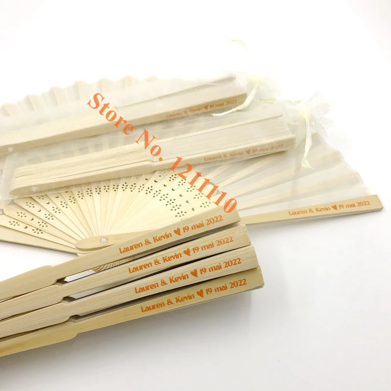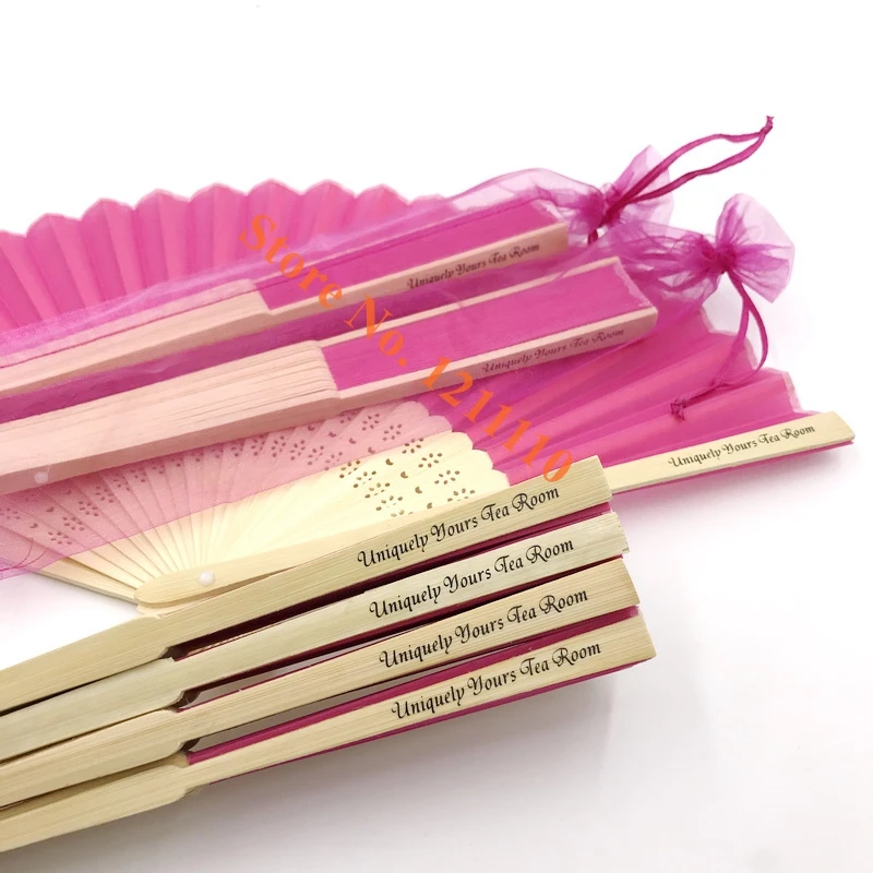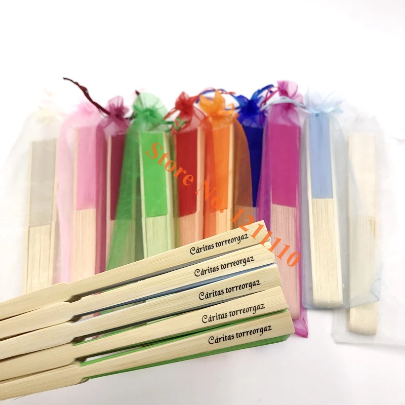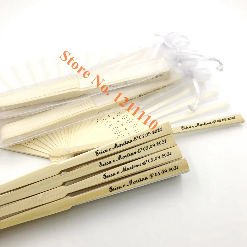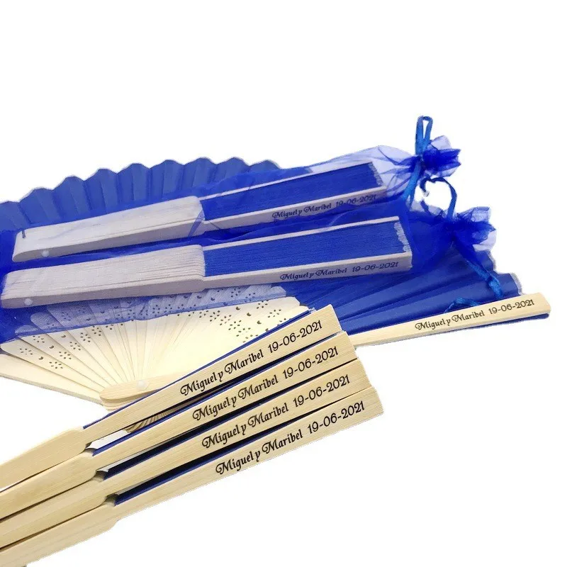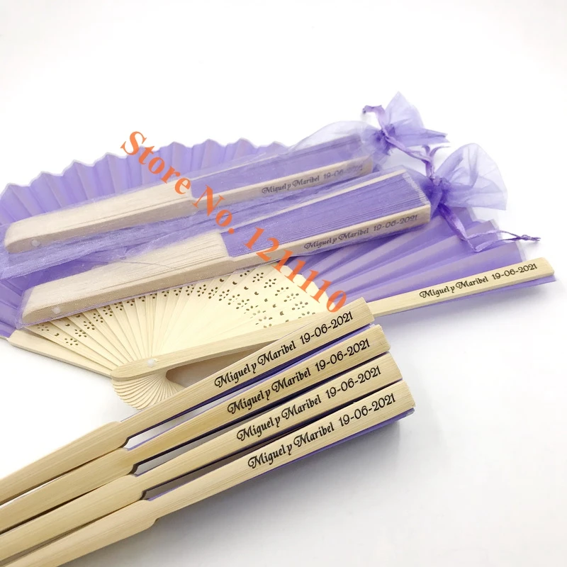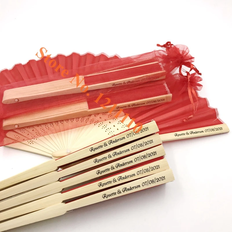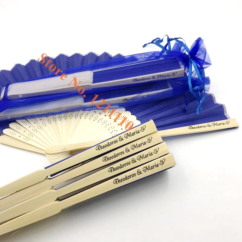 7075 шт. свадебный веер с шелкографией, логотип в сумке из органзы, тканевый складной веер, индивидуальное имя невесты и жениха