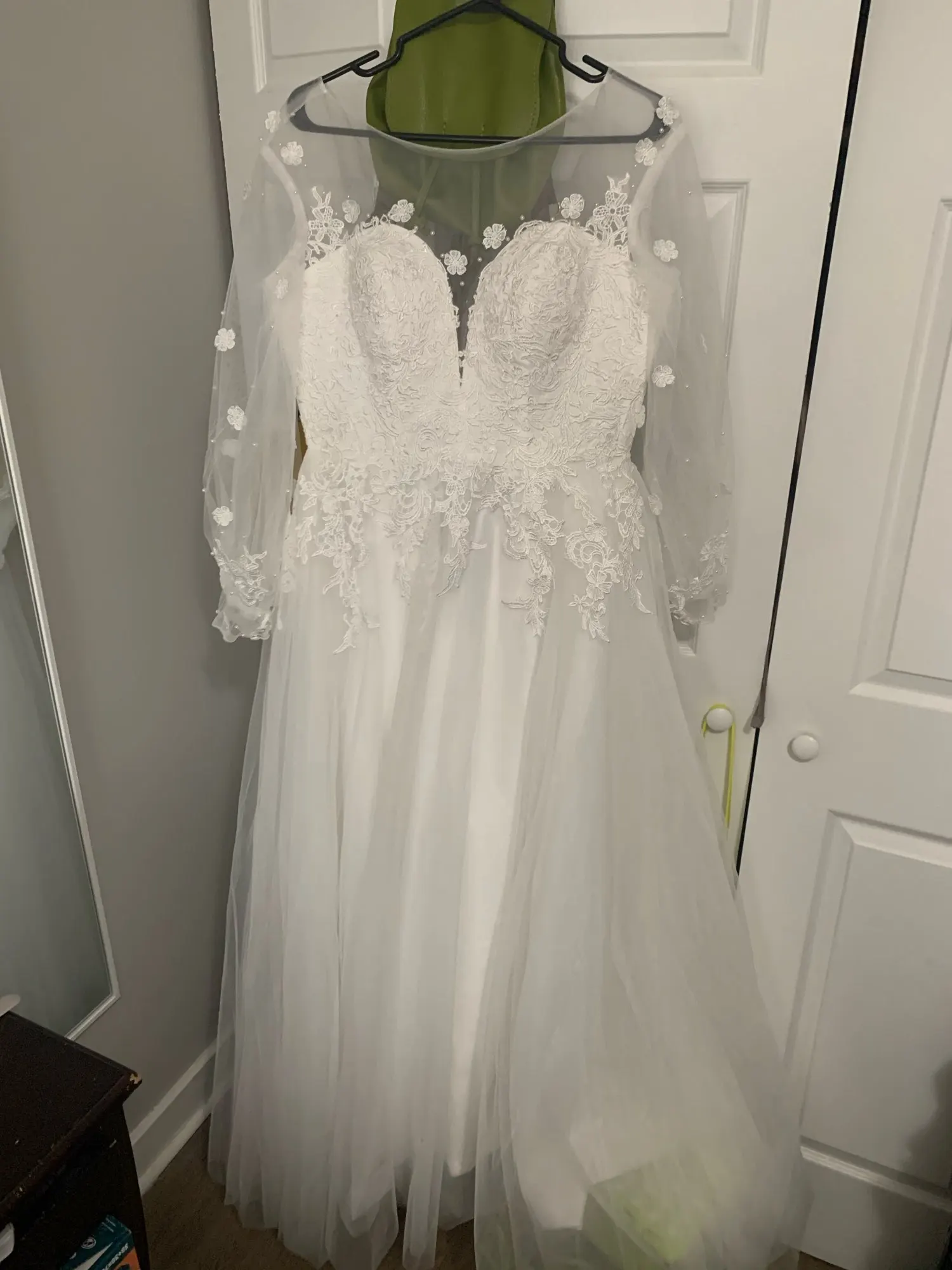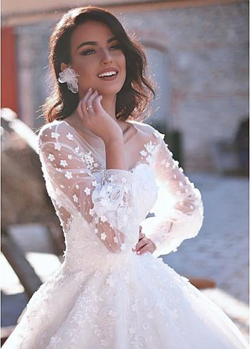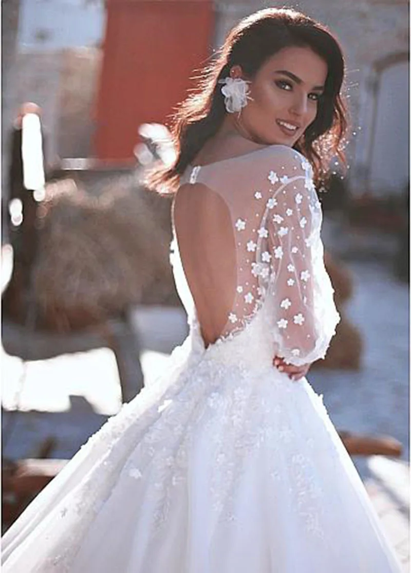 Свадебное платье с длинным рукавом, круглым вырезом и аппликацией и...