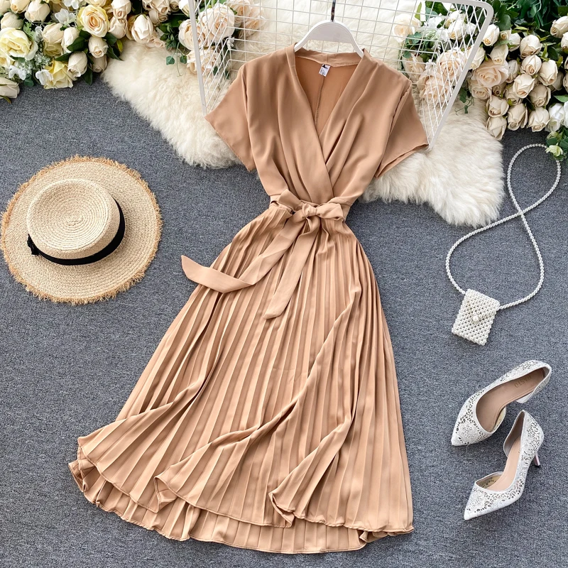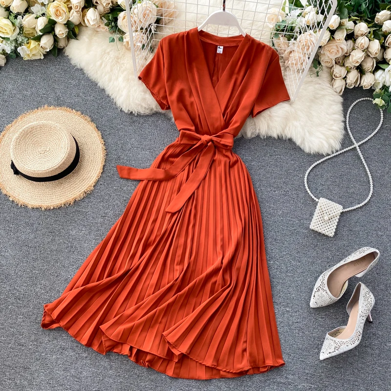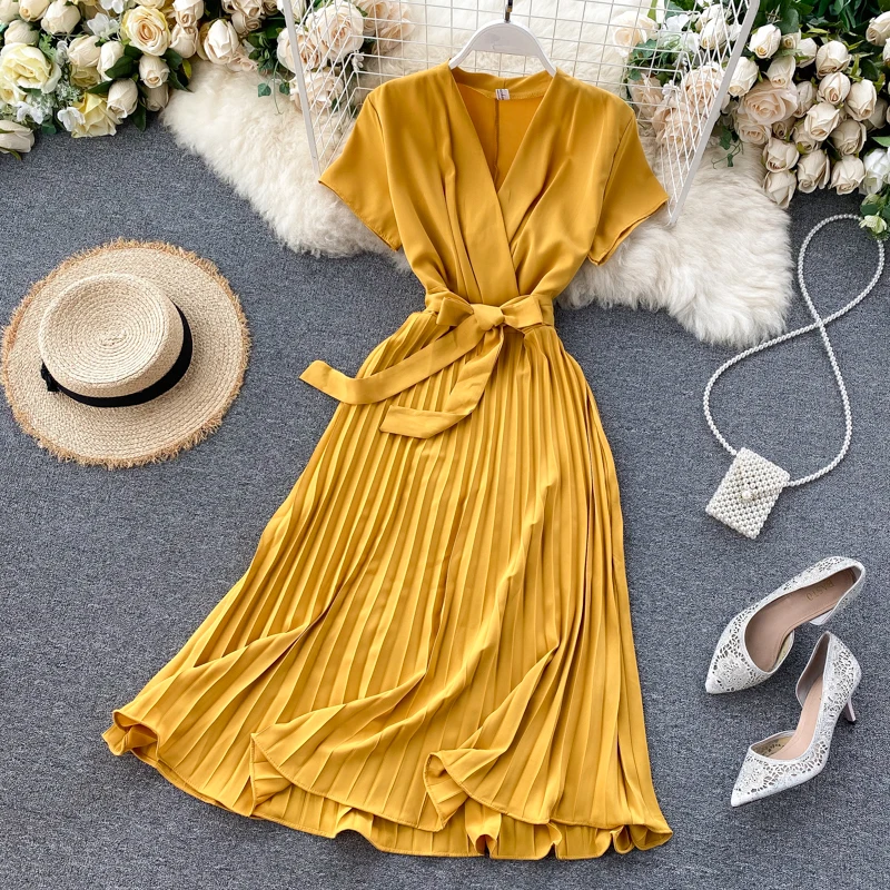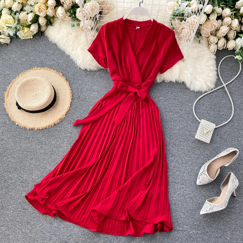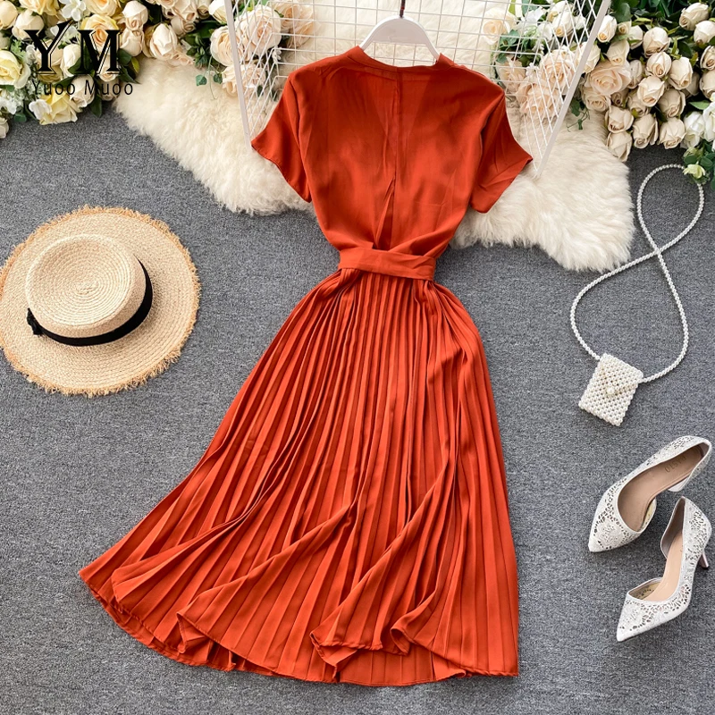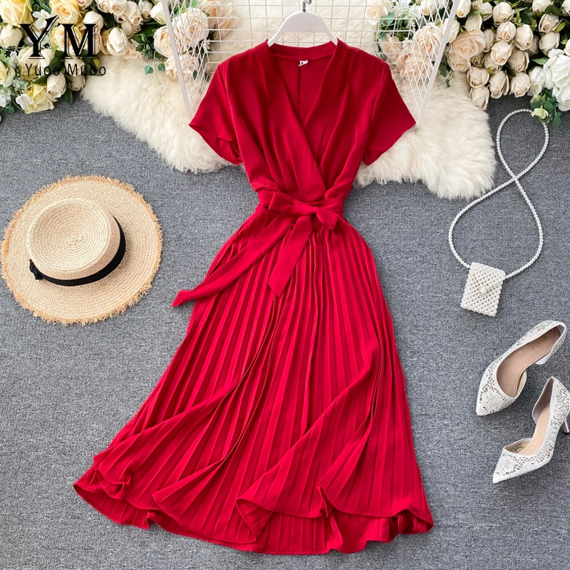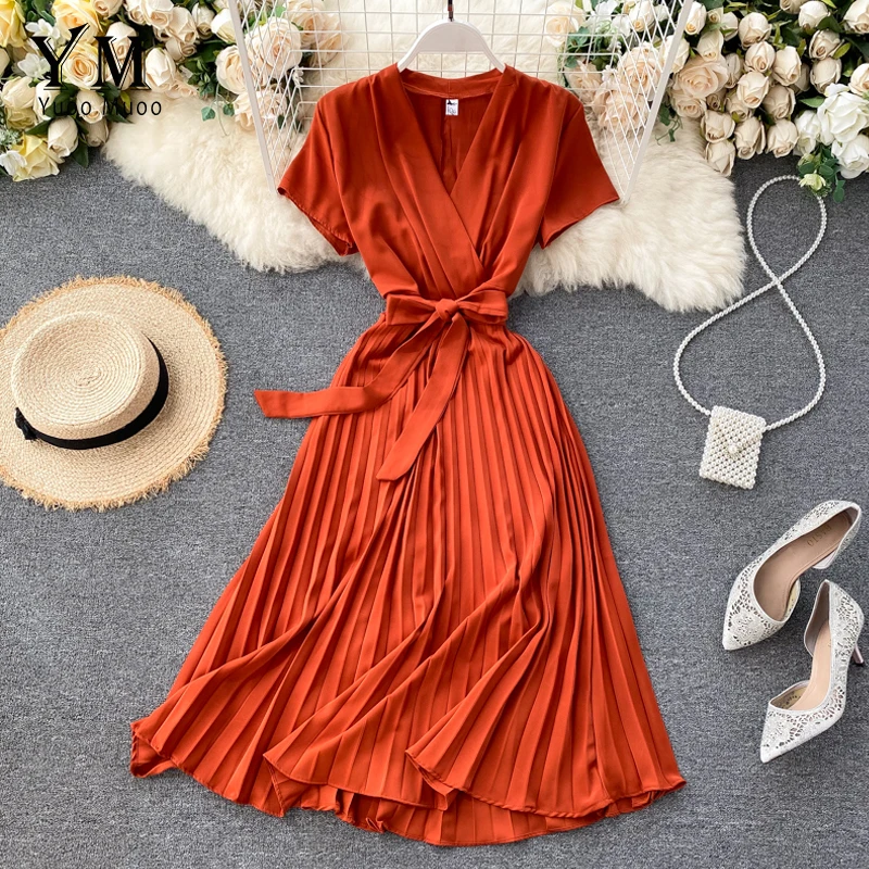 Платье YuooMuoo женское с V-образным вырезом, однотонное Бандажное Длинное Элегантное плиссированное платье средней длины, вечерний сарафан, лето 2020