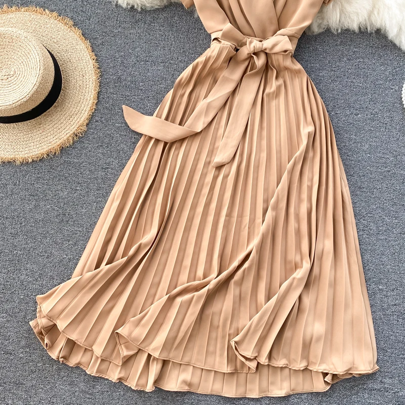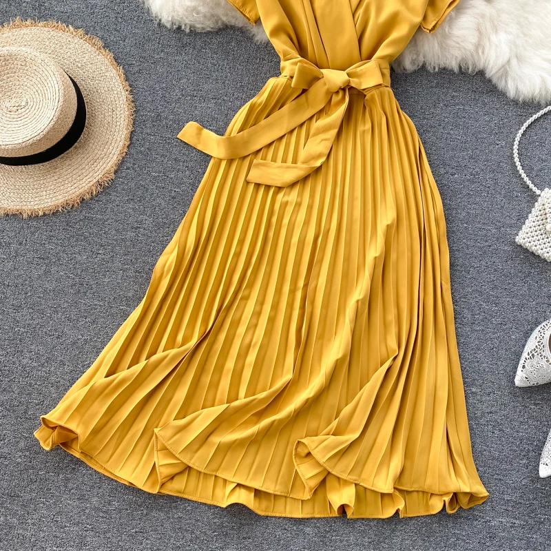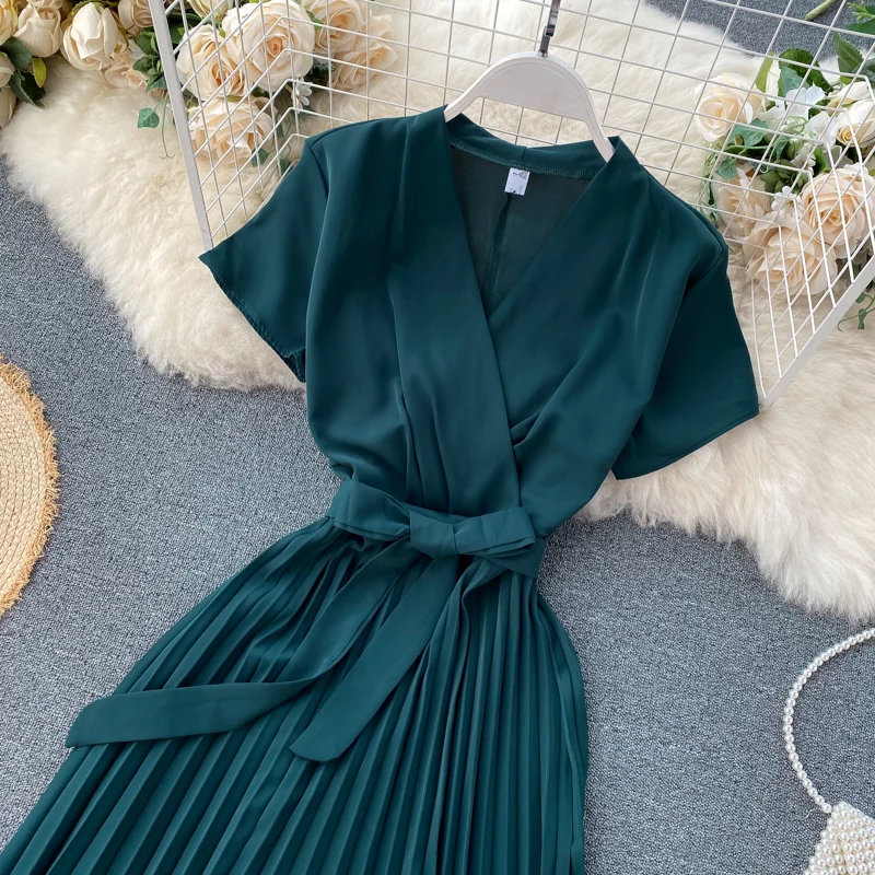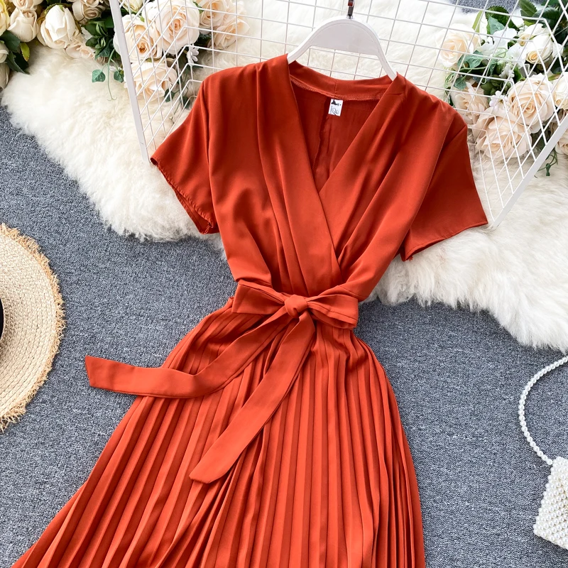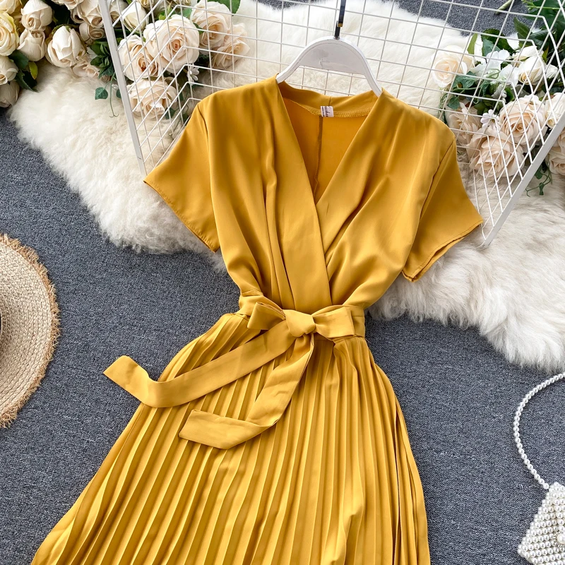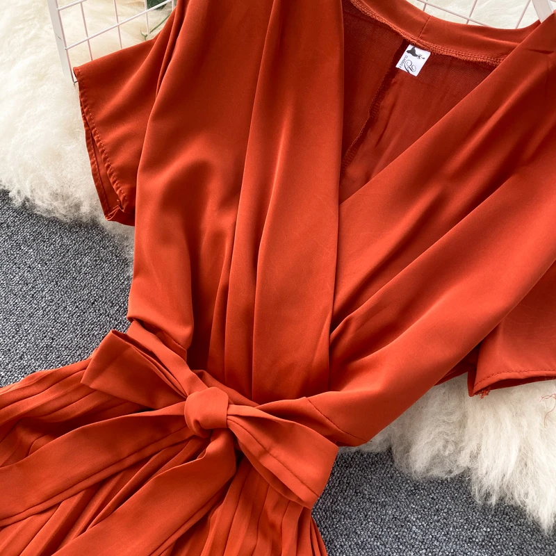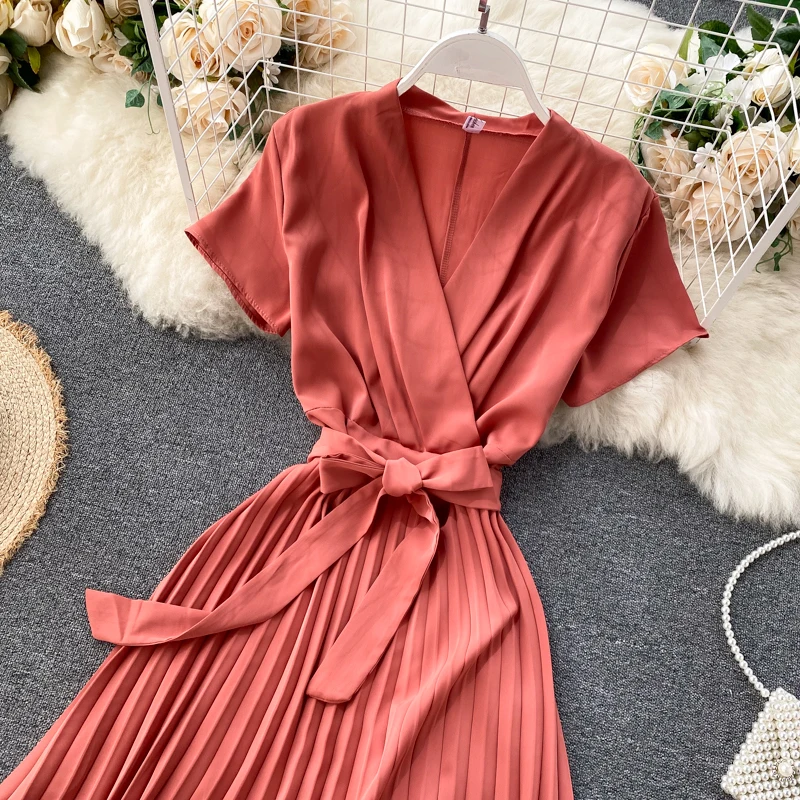 Платье YuooMuoo женское с V-образным вырезом, однотонное Бандажное Длинное Элегантное плиссированное платье средней длины, вечерний сарафан, лето 2020