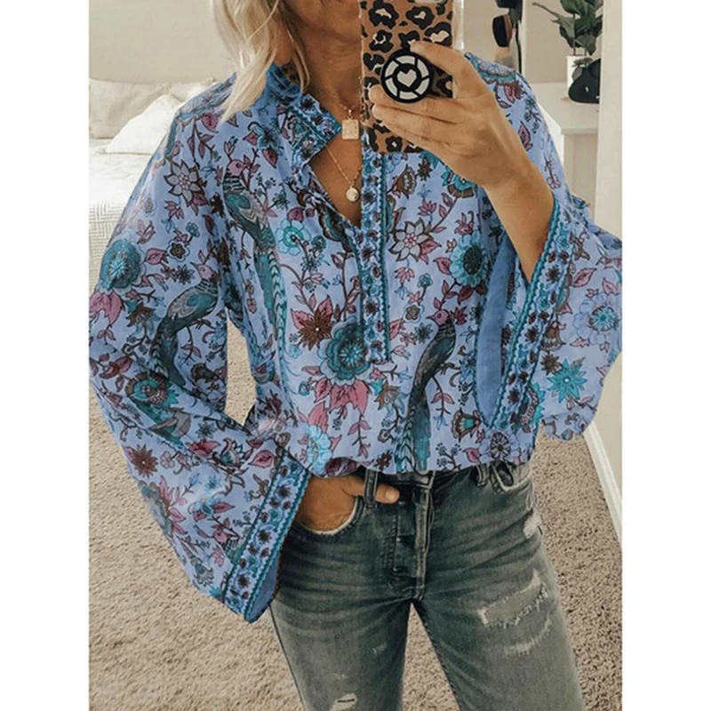 Женские блузки с принтом CINESSD, повседневные свободные топы с воротником-стойкой, V-образным вырезом и длинными рукавами, пуговицы, 2020, пуловер, женские футболки, блузки, размера плюс