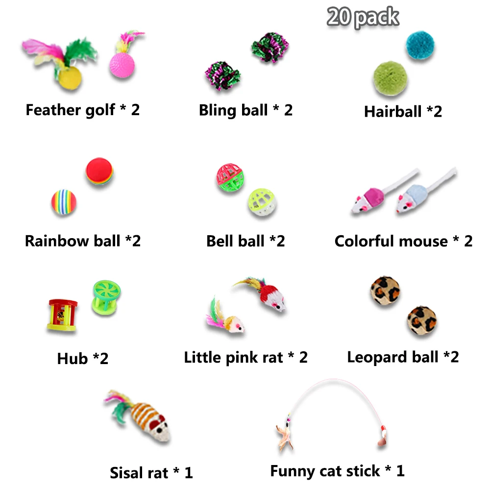 Набор игрушек для кошек 20 шт., интерактивные котята, игрушки в ассортименте, пушистая мышь с перьями для кошек, мерцающие шарики, колокольчики для кошек, щенков, кошек