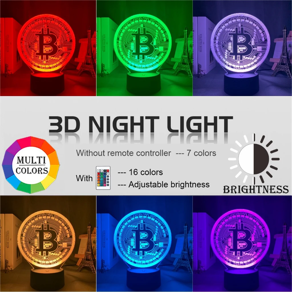 Акриловый светодиодный ночсветильник Биткоин для комнаты, декоративный ночсветильник, сенсорный датчик, 7 цветов, меняющий батарею, настольный ночник 3d