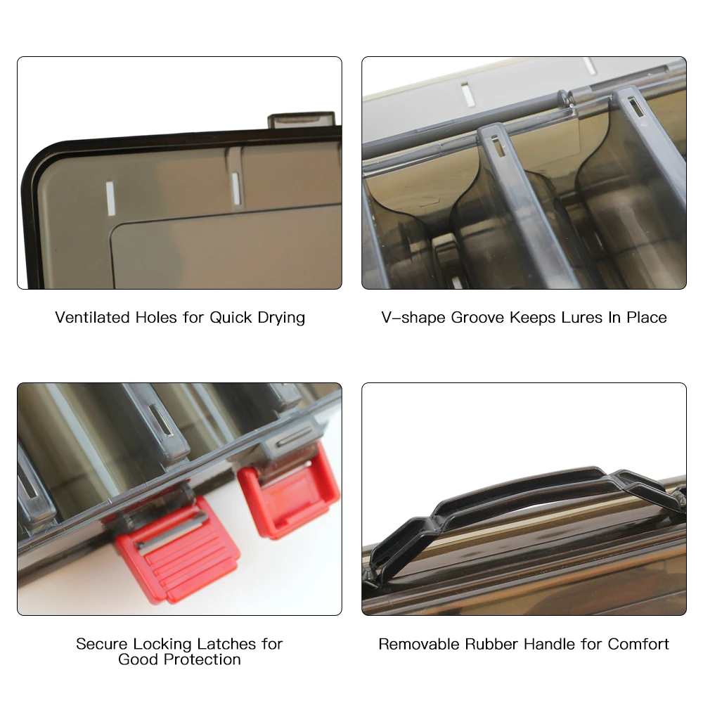 Особенности:Двухсторонний дизайн с надежными фиксирующими защелками.14 отдельных отсеков предотвращают сматывание насадок или крючков.Каждый отсек с v-образной канавкой, чтобы держать крючок приманки на месте.Прозрачная крышка для ясной видимости вашей приманки.Съемная резиновая ручка для удобной переноски.