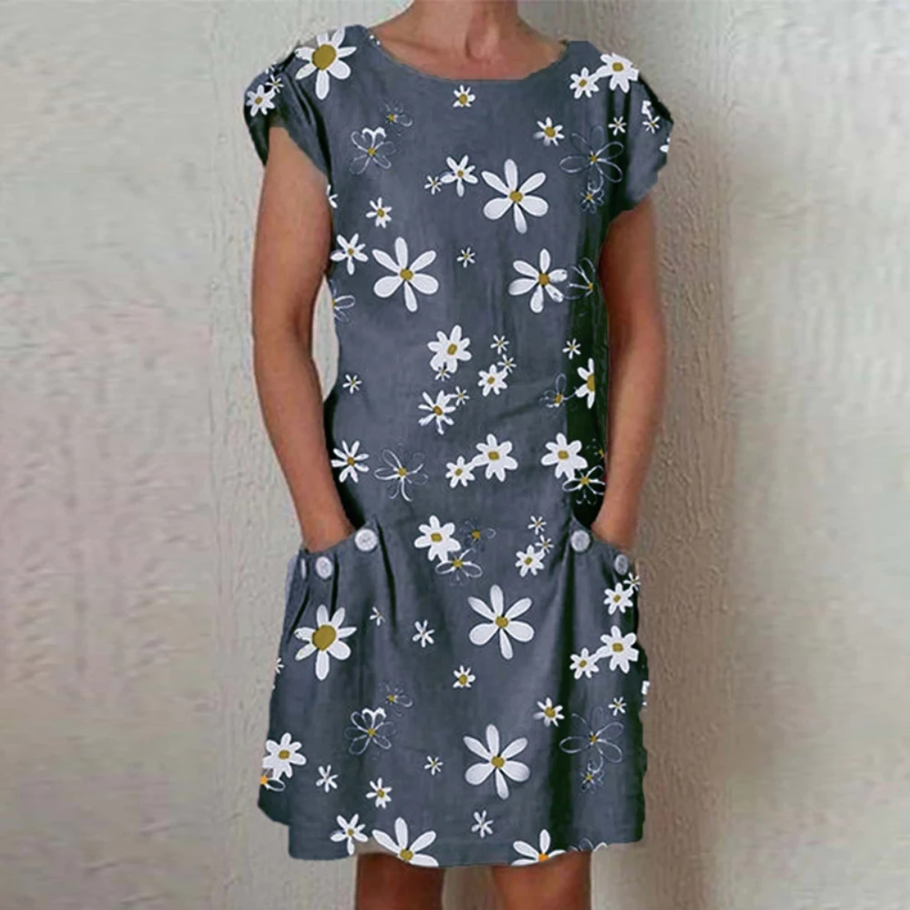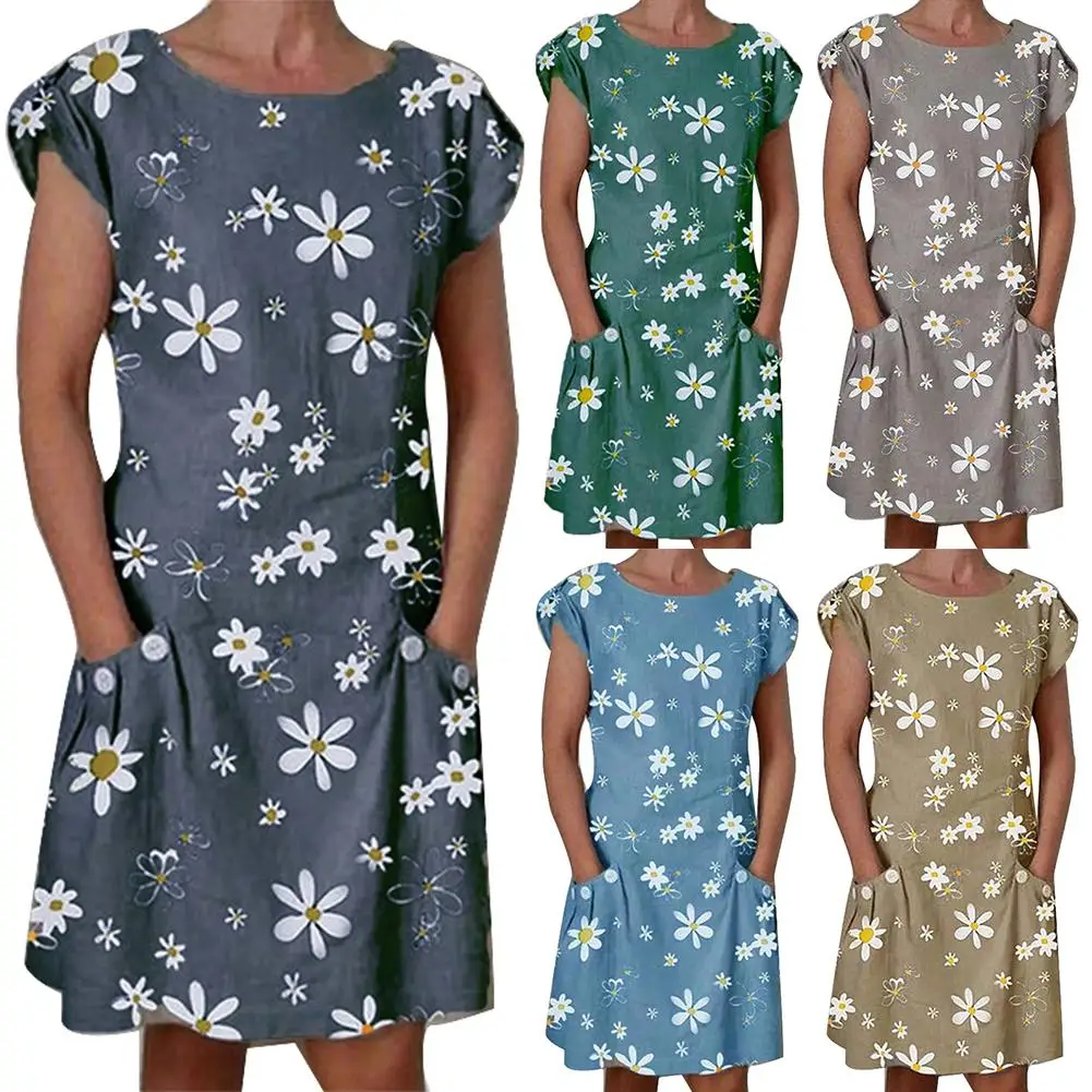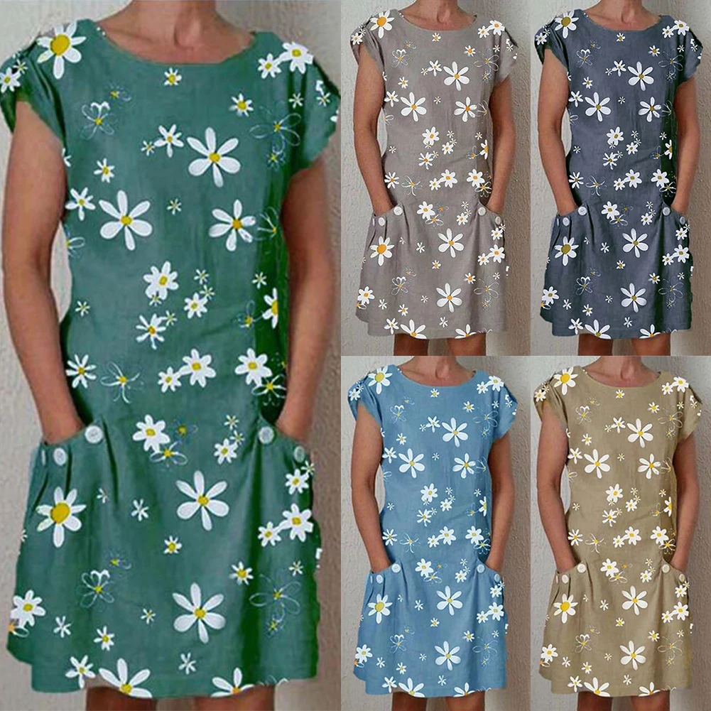 Для женщин Повседневное с круглым вырезом короткий рукав, принт карманы; Платье до колен с прекрасным подаркам