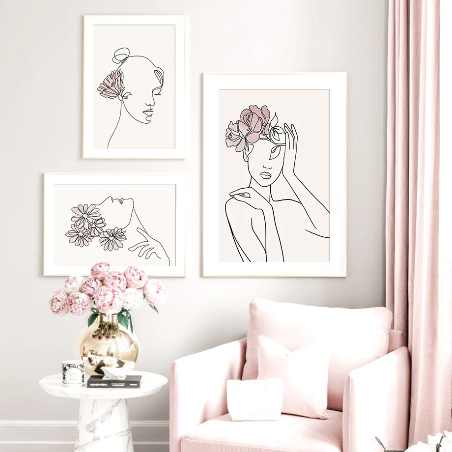 Настенная живопись на холсте Абстрактная Сексуальная линия девушка розовый цветок пиона скандинавские плакаты и принты настенные картинки для декора гостиной