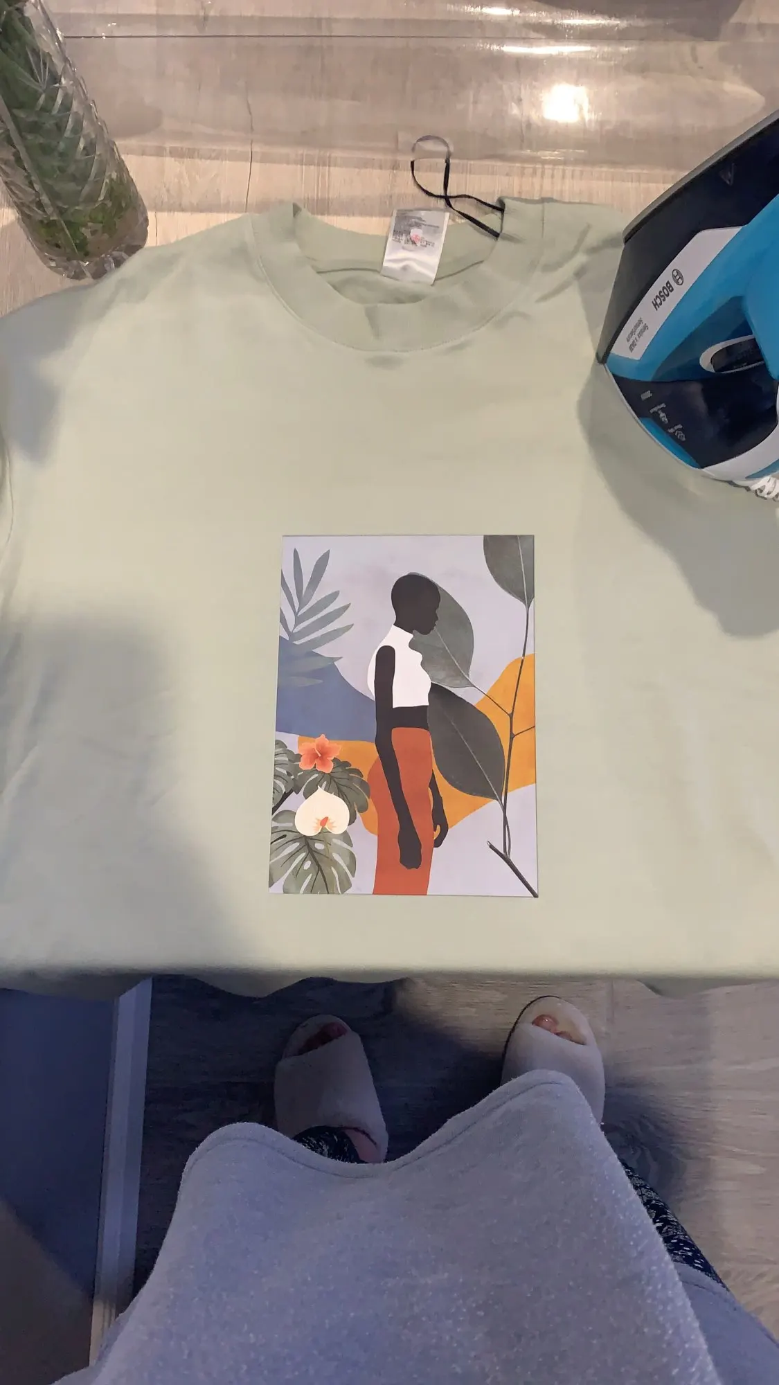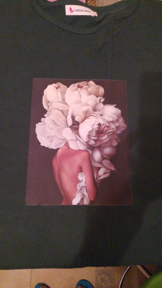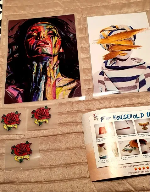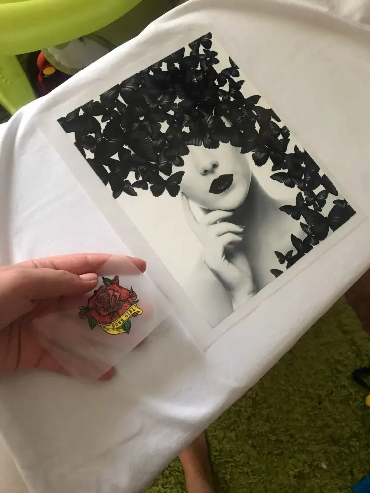 Легко наклеивается на одежду, ресунок отпечатывается четко. Когда утюгом прогладили, дайте наклейке остынуть, а потом сдирайте пленку. А то я час материлась и грела ее утюгом