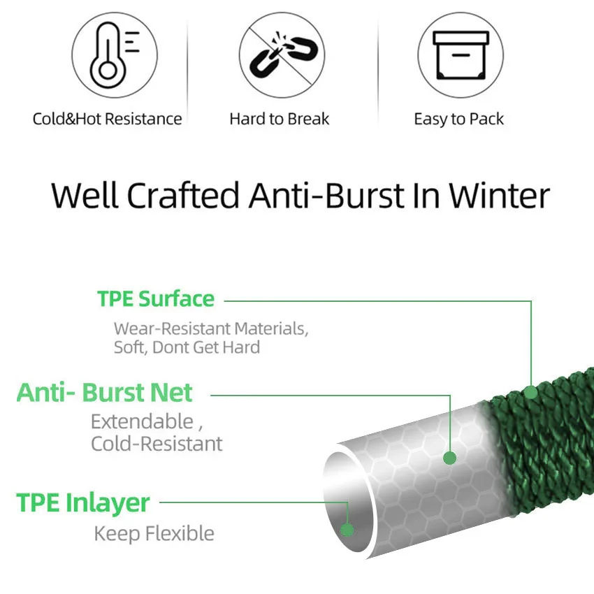 Этот шланг изготовлен из TPE материала, который дает ему хорошую способность анти-всплеск и мягкую поверхность. И это не легко сломать и не будет трудно зимой, как обычные пластиковые шланги. Поверхность покрыта антикоррозийным покрытием, которое имеет антикоррозийный эффект