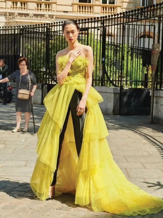 Длинное женское платье с оборками, из тюля, желтого цвета, без брет...