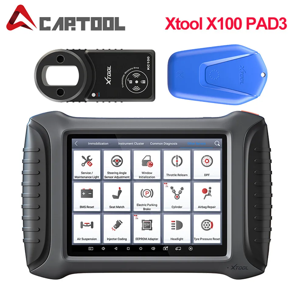 X100 PAD3(X100 PAD Elite) Является профессиональным программистом для ключей планшета, который не только предоставляет клиентам ключевые программирование, но и поставляет передовые специальные функции. Оснащен KC100 ключевой программист, X100 PAD Elite может выполнять: ключевой программирующий, сброс давления светильник сбросить сброс давления, светильник сброс, давление в шинах Предупреждение светильник сброс, EPB, сброс тела дроссельной заслонки, сброс DPF, сброс батареи, Калибровка угла рулевого управления и Полная система диагностики с контролем BI-DIRECTIONAL (активный тест)Xtool X100 PAD Elite-идеальное решение для мастерских и техников, требующих профессиональной диагностики автомобиля.