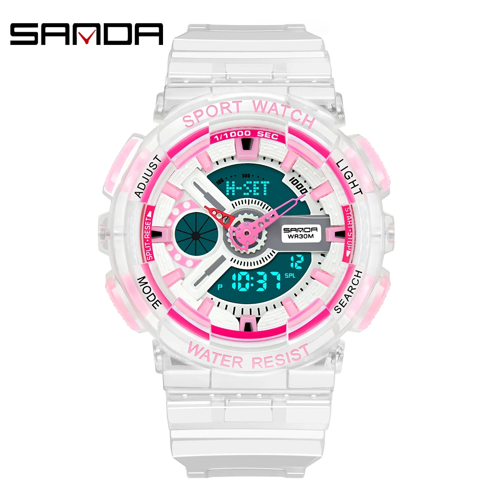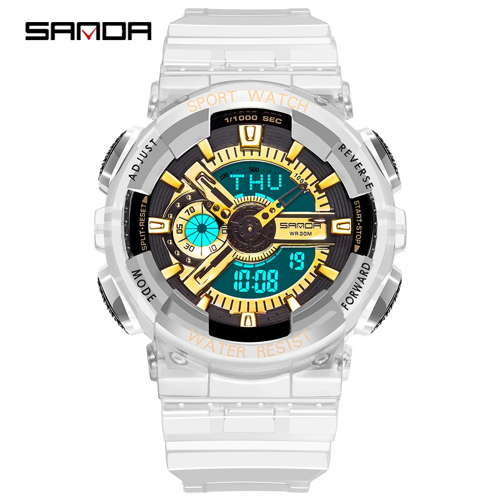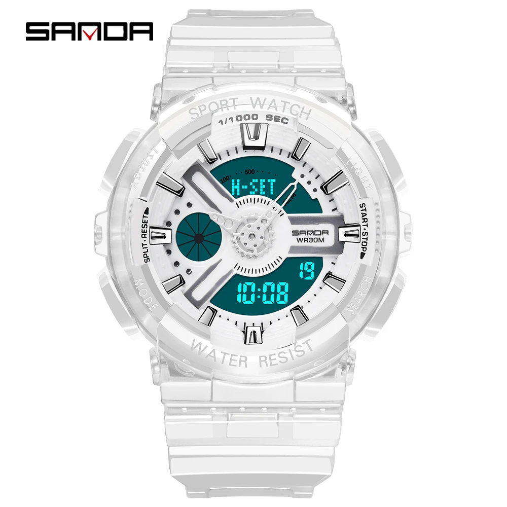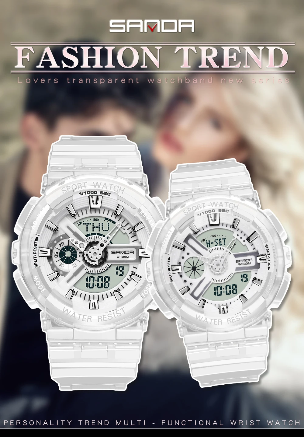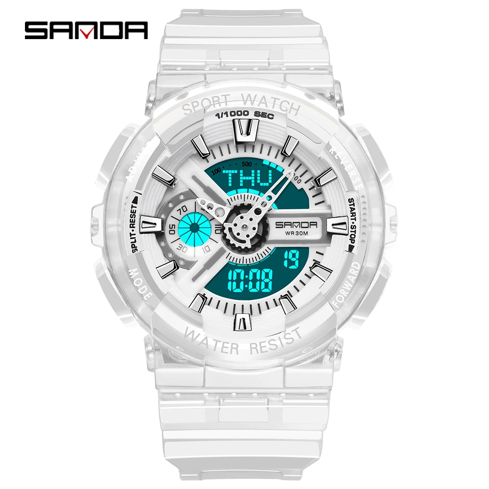 Часы наручные Sanda мужскиеженские прозрачные, брендовые Водонепроницаемые многофункциональные светящиеся спортивные с двойным дисплеем, для влюбленных