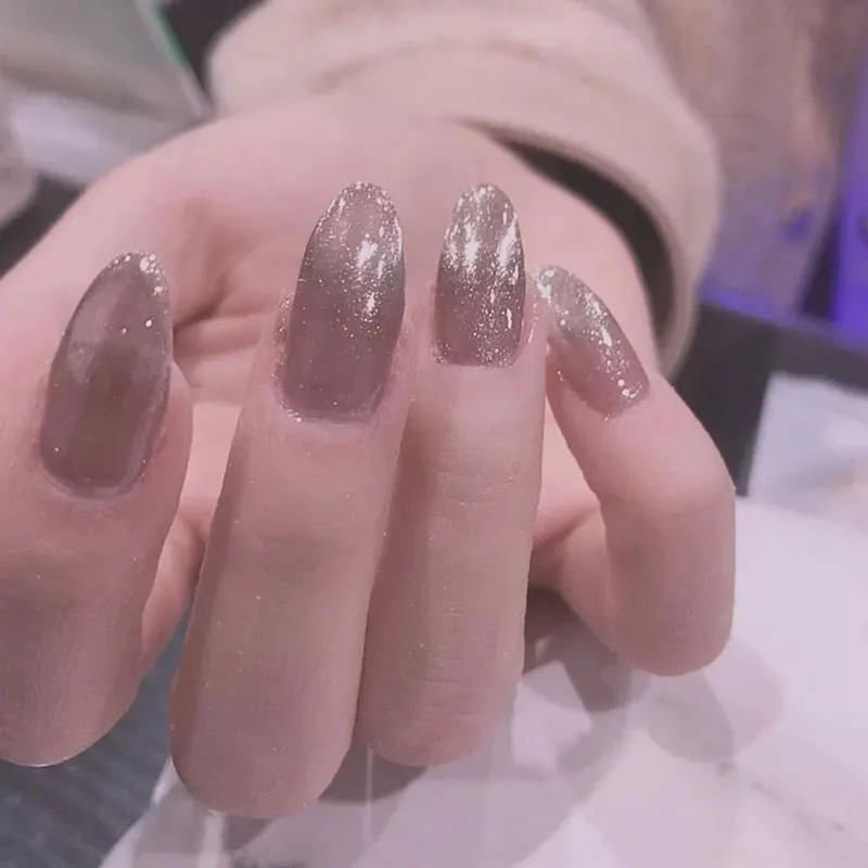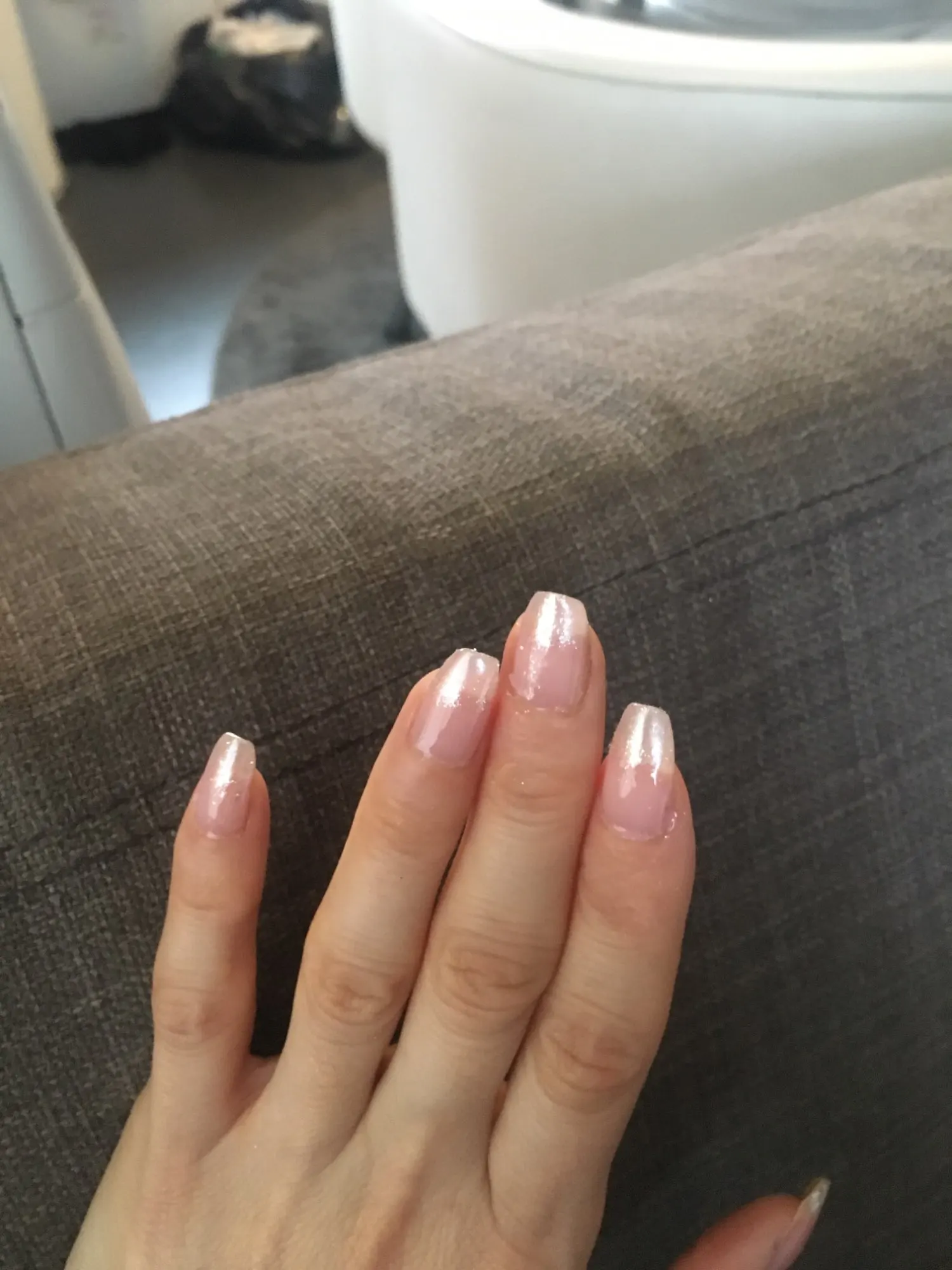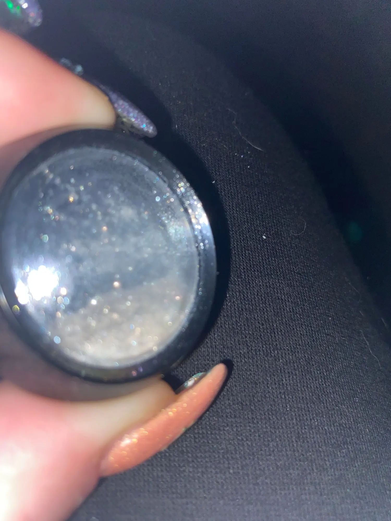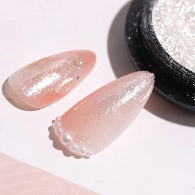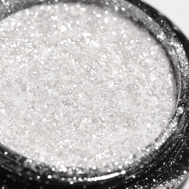 Как на картинке. Есть мелкие и более крупные частички, мелкие втираются в топ без липкого слоя образуя тонкую зеркальную плёнку, крупные остаются на спонже, можно попробовать на липкий слой, чтобы наверняка))) Очень красивая штука. Рекомендую товар и продавца!