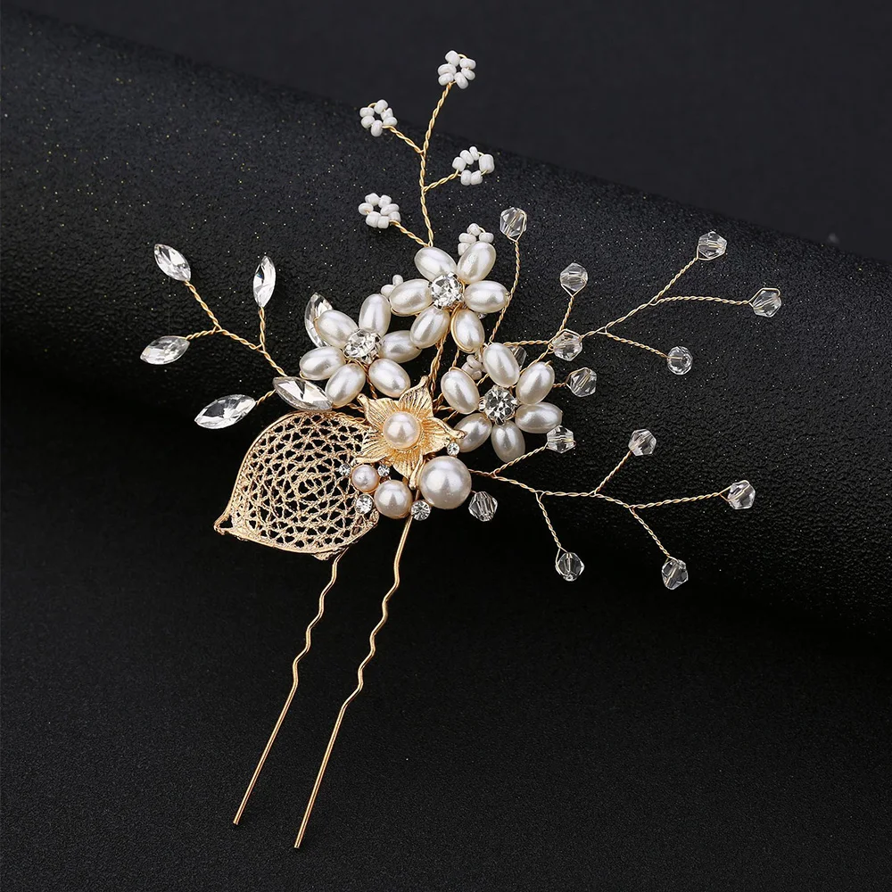 Заколка для волос U-образной формы, с листьями и жемчугом, из сплава, заплетать волосы в косу