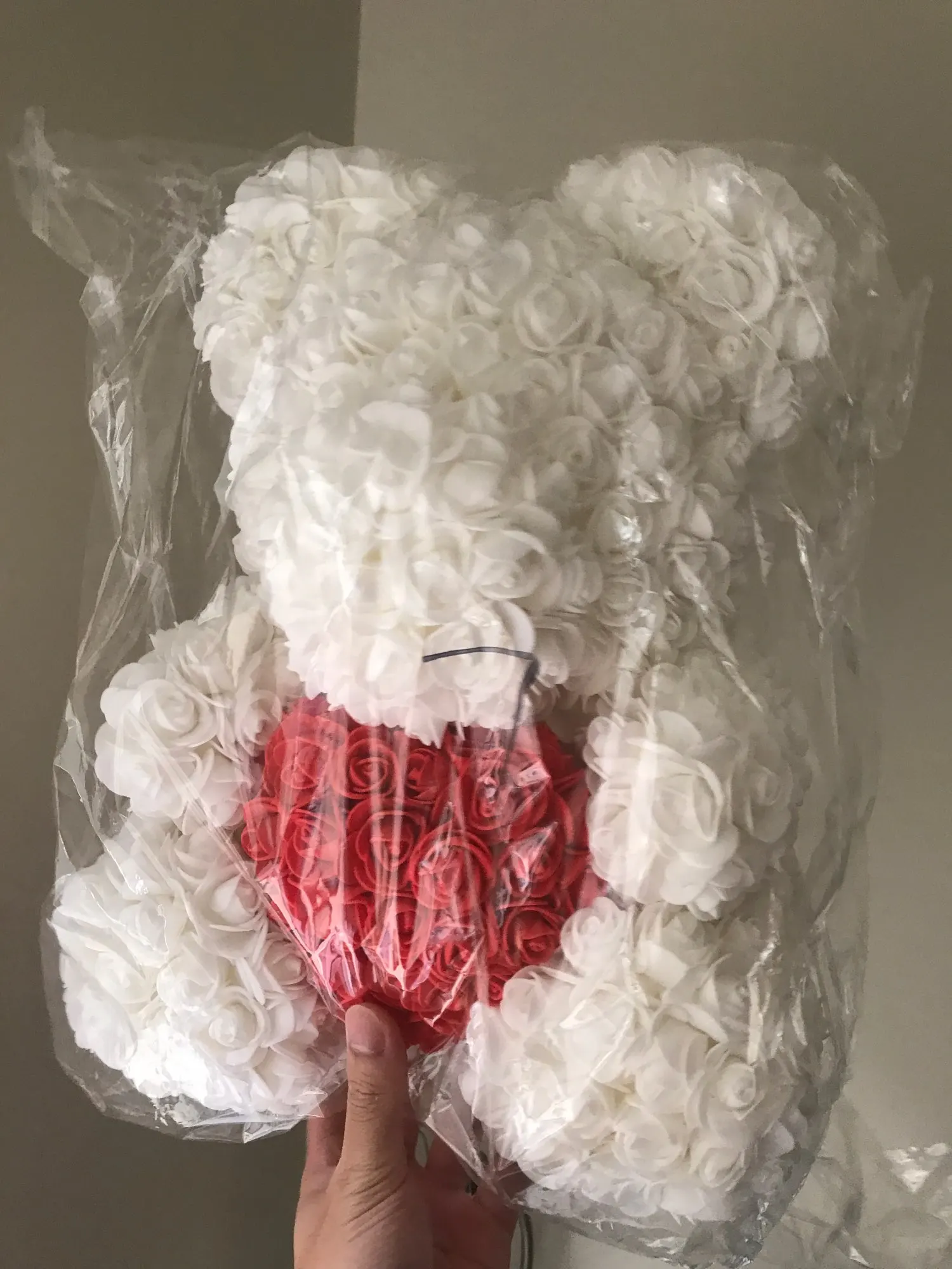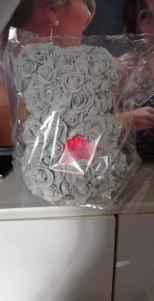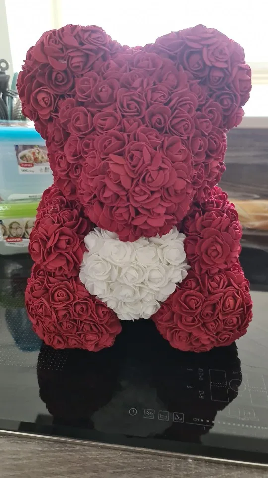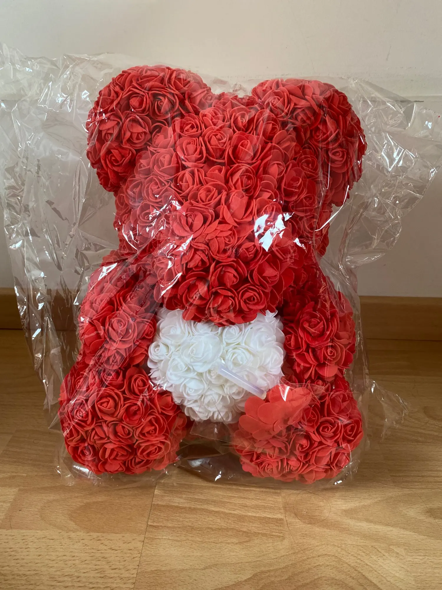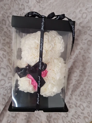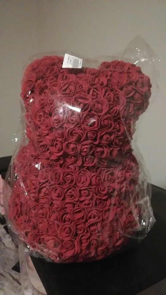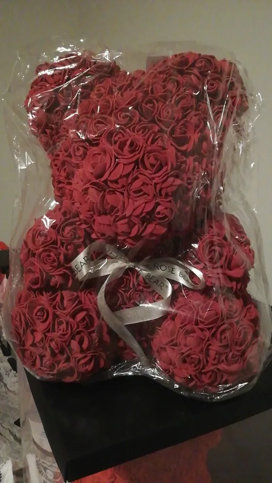 Bear is very nice. I was worried when I saw package ( just 3 layers of foil including bubble one - no box. Suprisingly bear was in great condition and I didn't find any squashed roses. It smells a bit like rubber or glue so I recommend to keep it out of the bag for couple of days and spray it with some nice perfumes. It took about 3 weeks to get it in Poland. I recommend this seller though hasn't replied my question. Must be busy before Valentines.