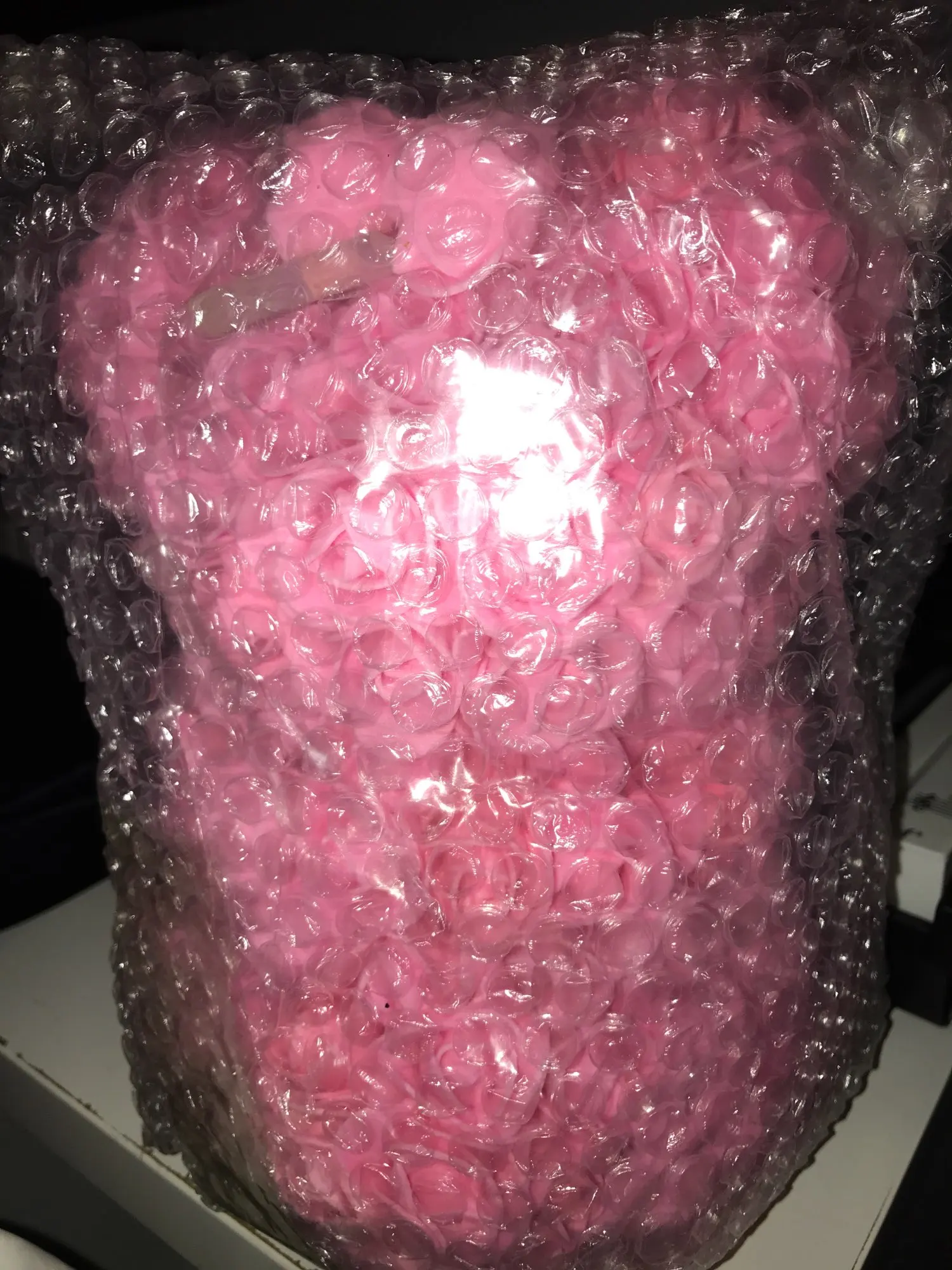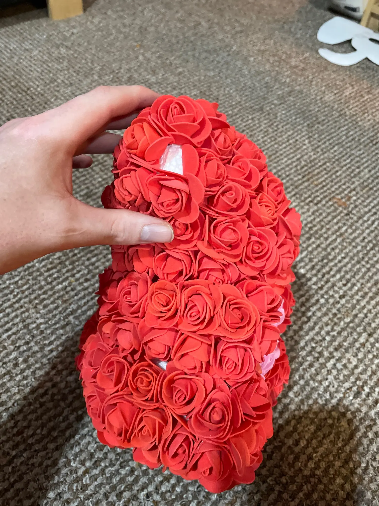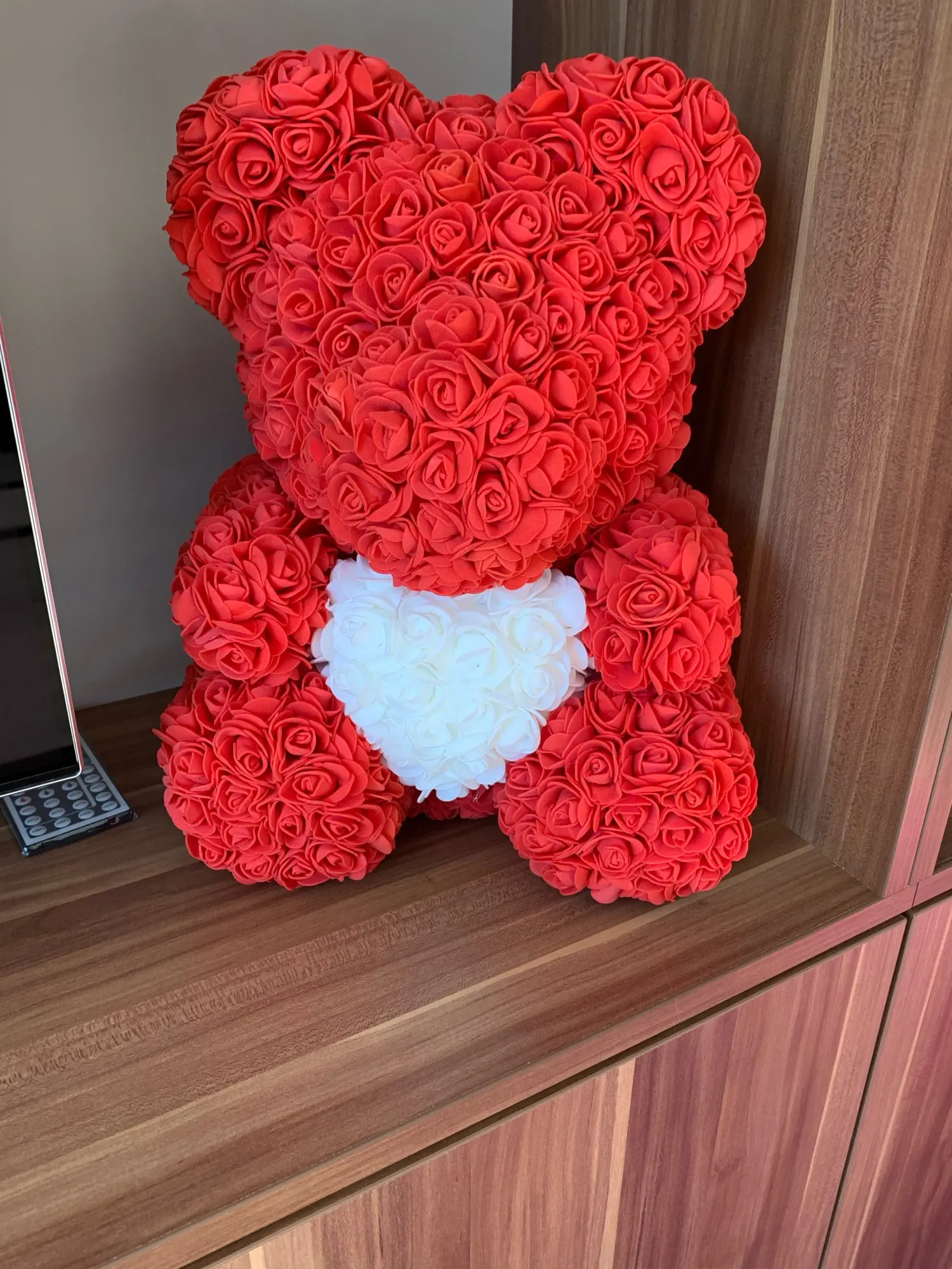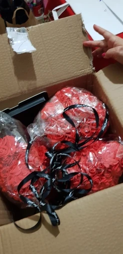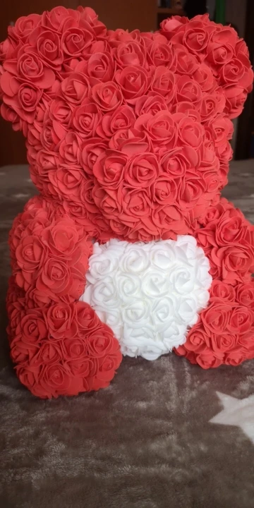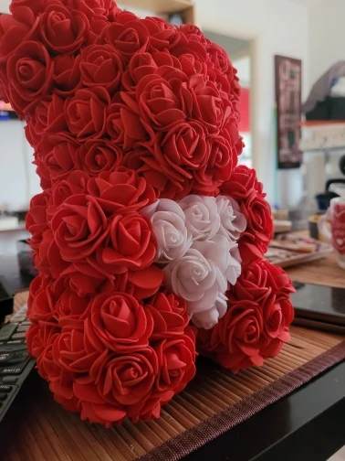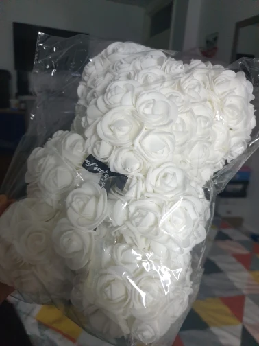 Bear is very nice. I was worried when I saw package ( just 3 layers of foil including bubble one - no box. Suprisingly bear was in great condition and I didn't find any squashed roses. It smells a bit like rubber or glue so I recommend to keep it out of the bag for couple of days and spray it with some nice perfumes. It took about 3 weeks to get it in Poland. I recommend this seller though hasn't replied my question. Must be busy before Valentines.