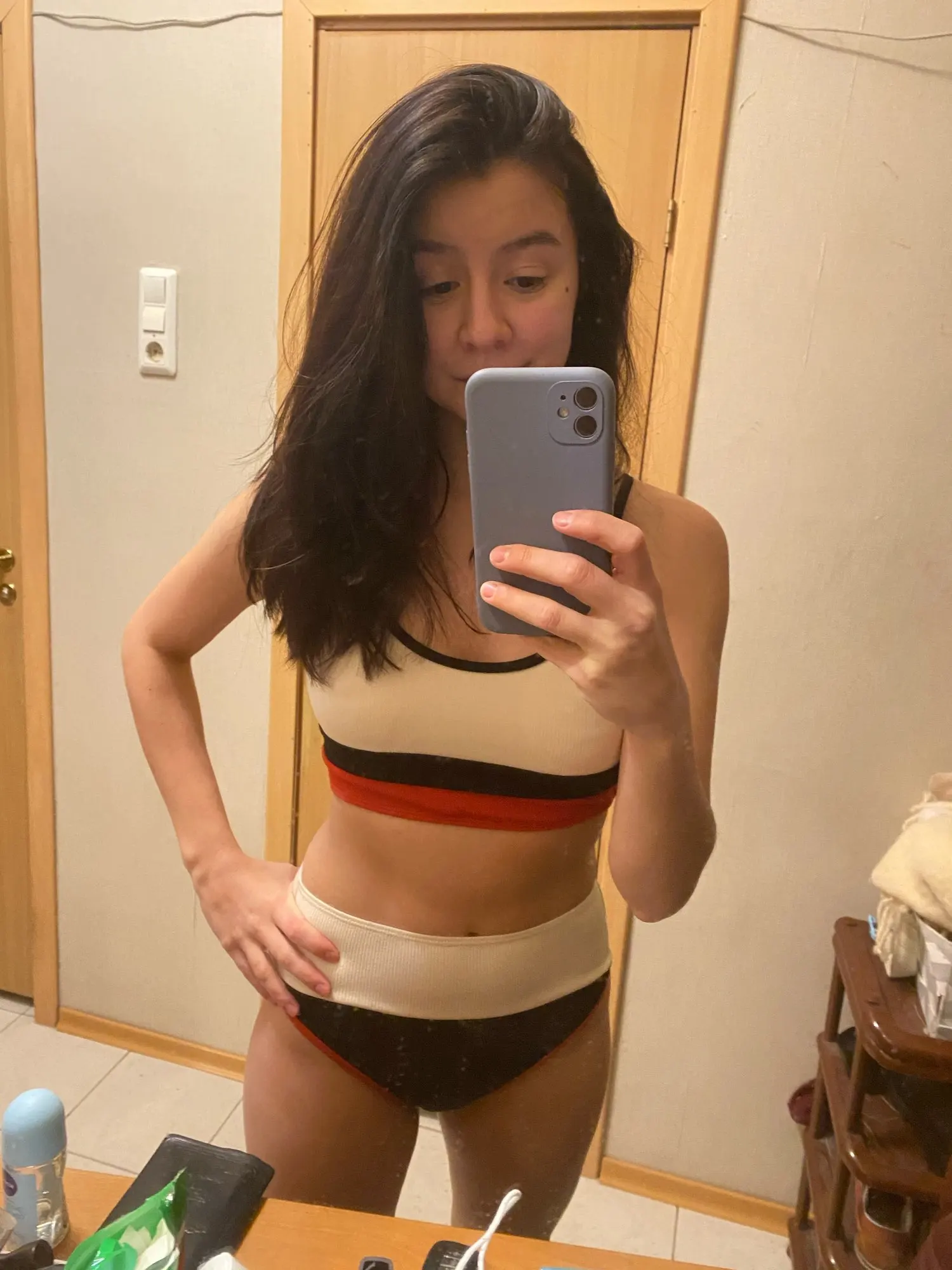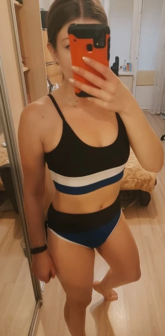 Быстрая отправка, доставка за три недели. Очень хорошее качество, без дефектов и торчащих ниток. На не идеальную фигуру сел хорошо, грудь третьего размера выглядит красиво в топе. Трусики с высокой посадкой, но если есть животик его будет видно (без утяжки) Размер соответсвует заявленному, ношу «М»